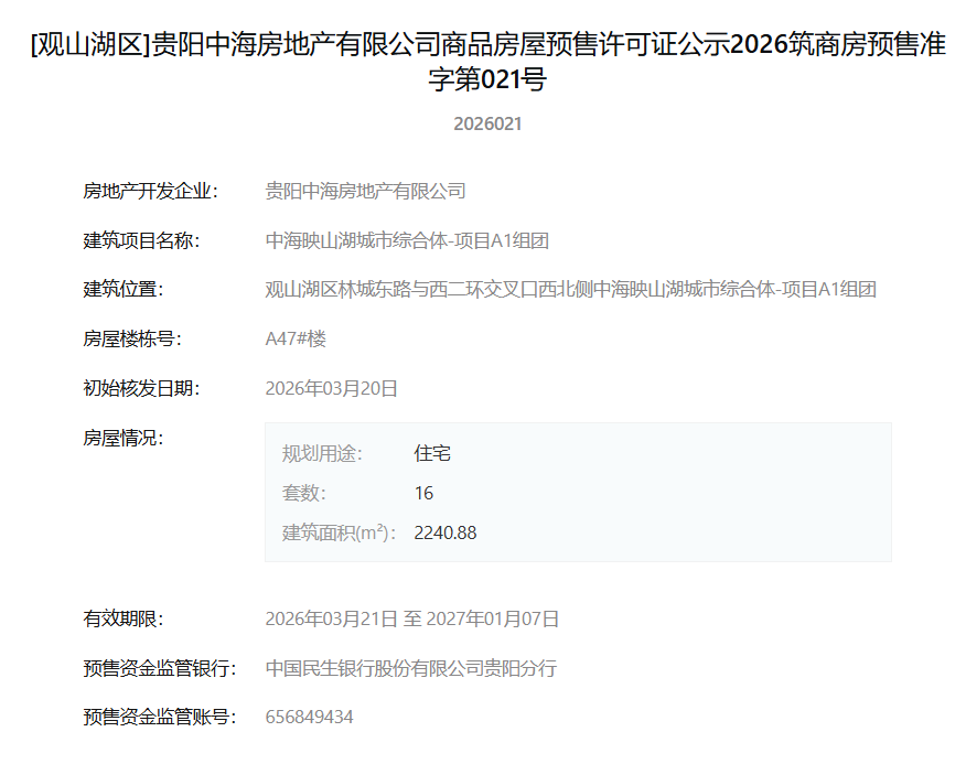 3月23日,据筑房网消息,中海映山湖城市综合体项目(中海新天地)A1组团新获一张预售证,16套住宅入市,建筑面积2240.88m²。