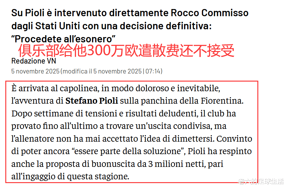 佛罗伦萨这边主教练皮奥利在最近被解雇,本来俱乐部聘请他是希望他能带领球队争夺欧冠席位,今年俱乐部也投入了巨资进行引援,但皮奥利的带队表现一直都很差。
