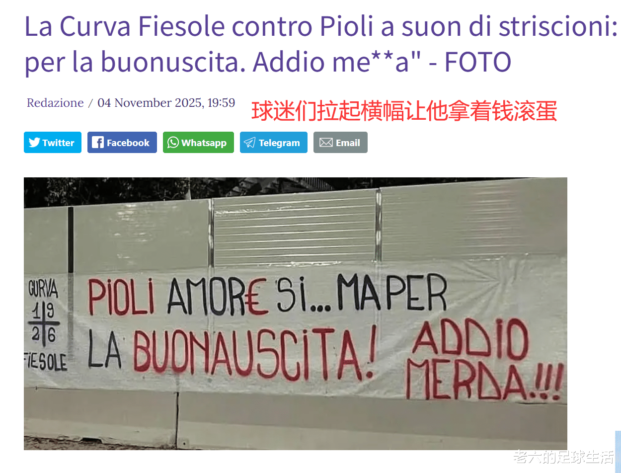 球迷们在弗兰基区也拉起横幅,上面写着“拿着你的遣散费!再见,混蛋!”看得出来他们对皮奥利是深恶痛绝了。