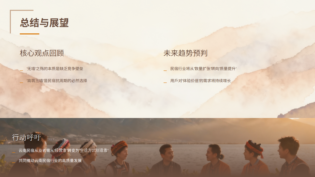 谁,是第二种人?在我看来,那些在“云南民宿百强榜”评选标准中,能够脱颖而出的民宿,大多具备了这种“抗周期”的“高墙”体质。作为云南省旅游民宿行业协会、我们推动“百强榜”评选的初衷,不仅是“表彰先进”,更是要在“迷雾”中,为行业“树立灯塔”。