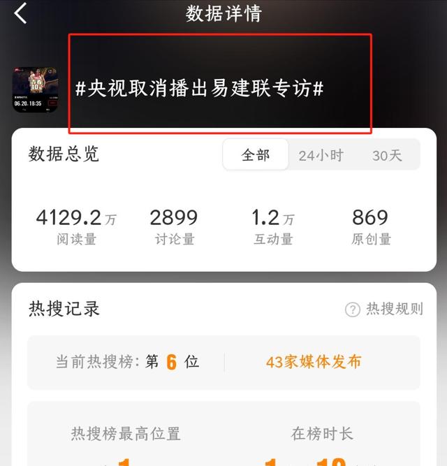 微博话题“央视取消易建联专访”阅读量已经破4千万。