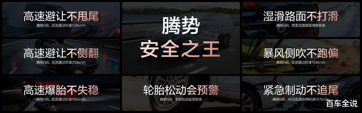 主动安全方面,得益于易三方,腾势N8L能够以128km/h高速避让不甩尾、210km/h高速避让(鱼钩测试)不侧翻、180km/h高速爆胎不失稳、154km/h暴风侧吹不跑偏、147km/h AEB自动紧急制动、不怕雨雪路面打滑、车轮松动监测系统,以科技安全守护家人出行安心。腾势汽车不愧被称为新能源汽车的“安全之王”。