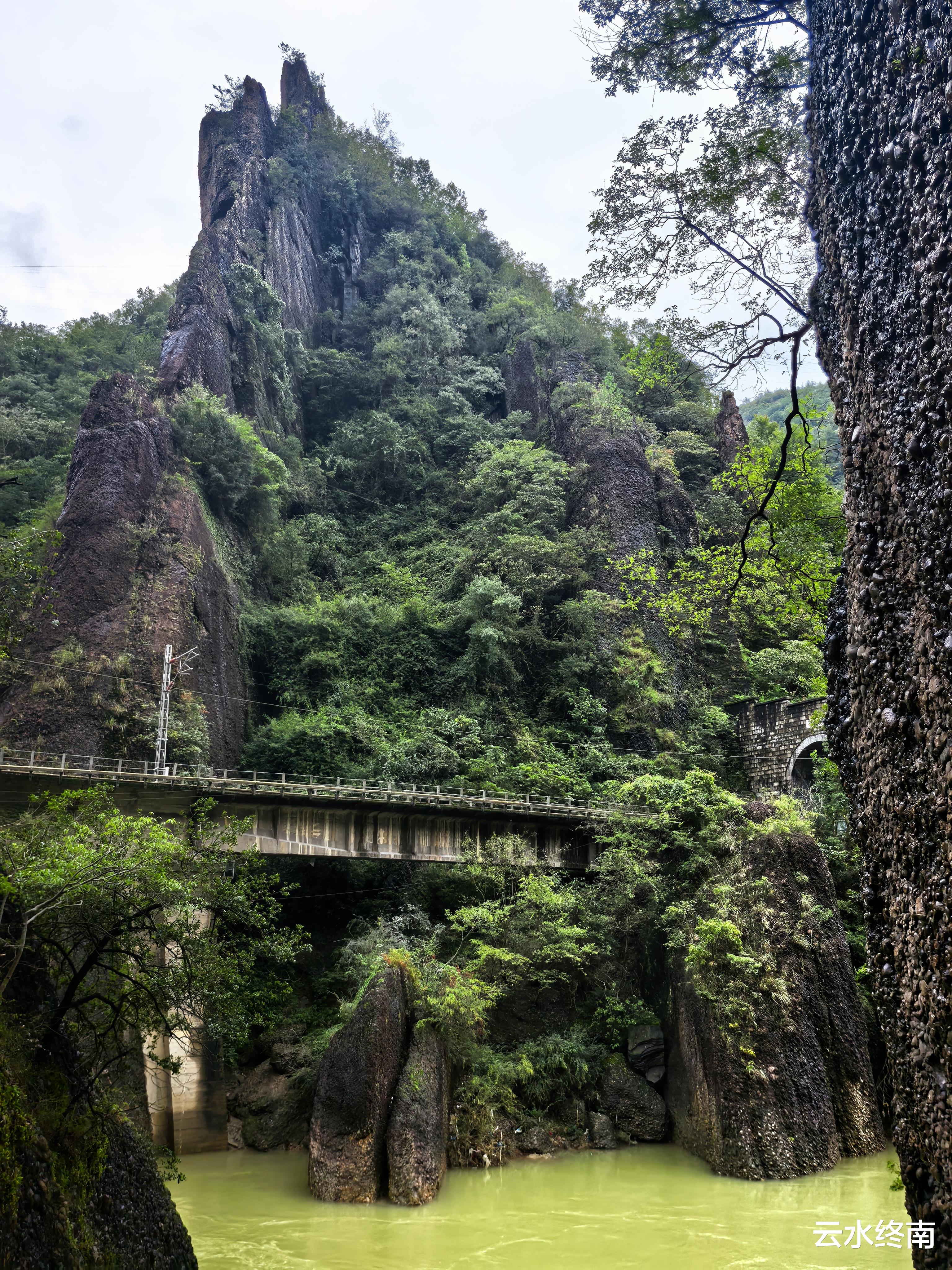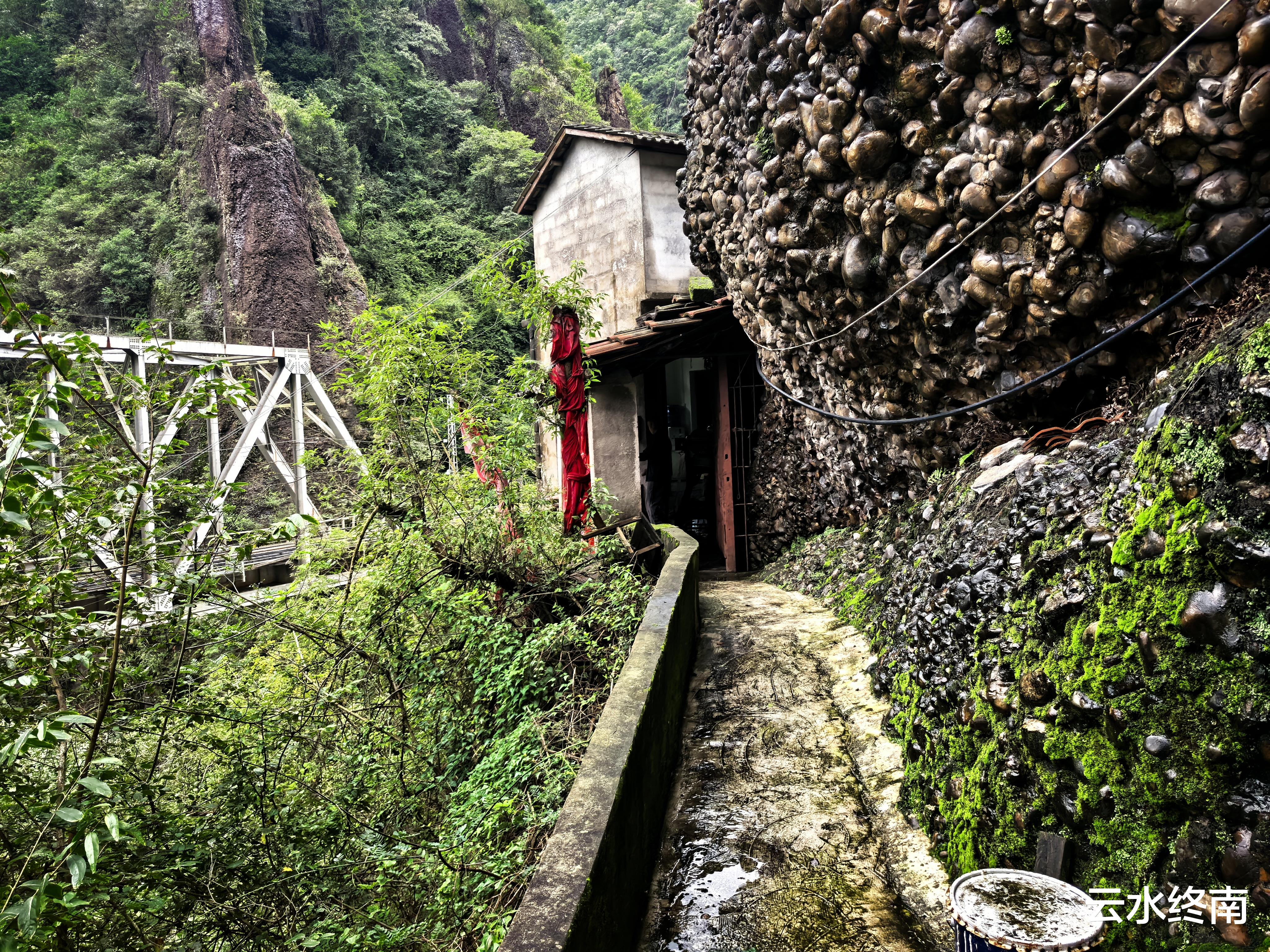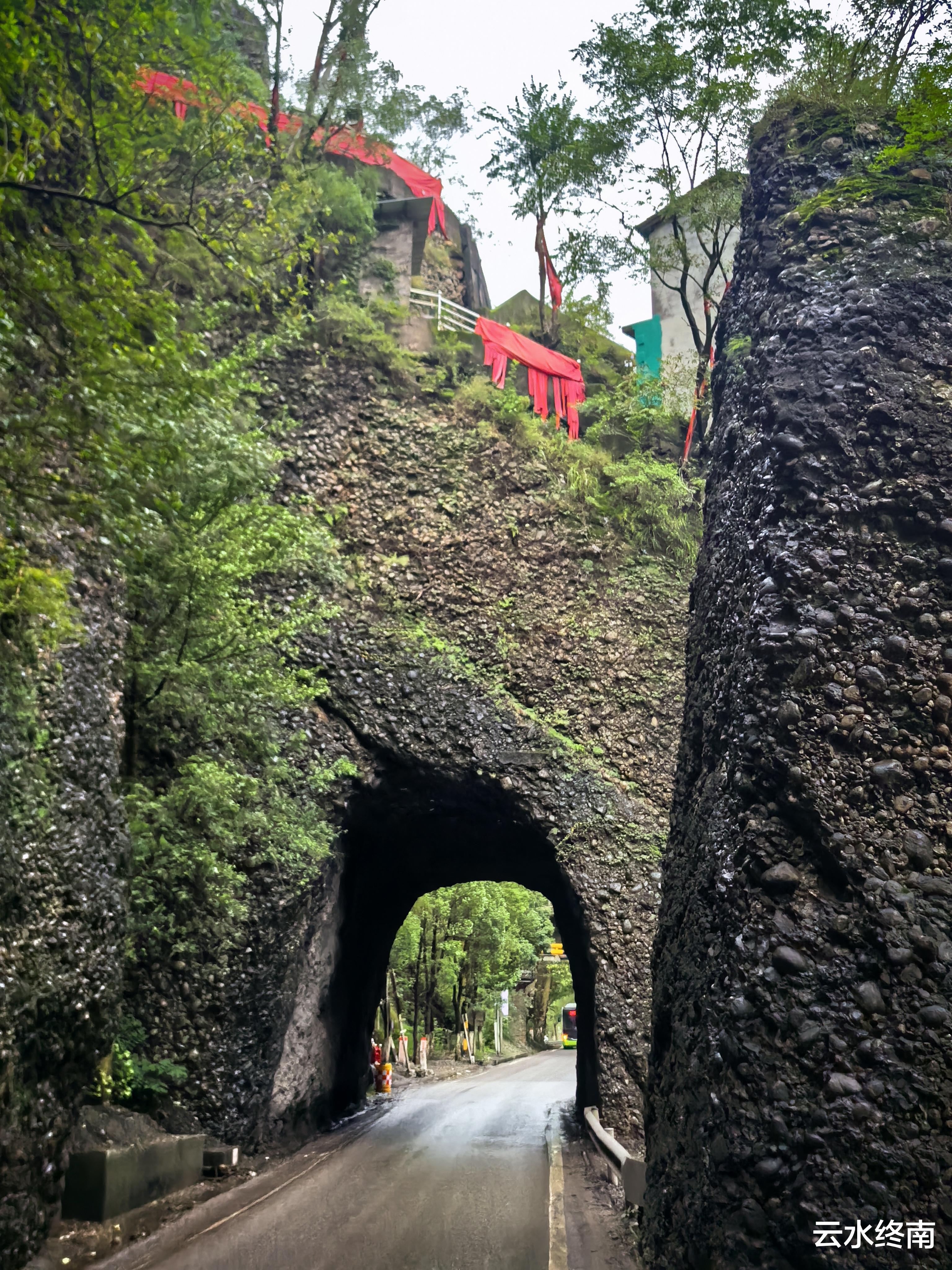 在隧道中间的空隙中行走,抬头只见上面的寺庙,四周壁立,让人感慨。