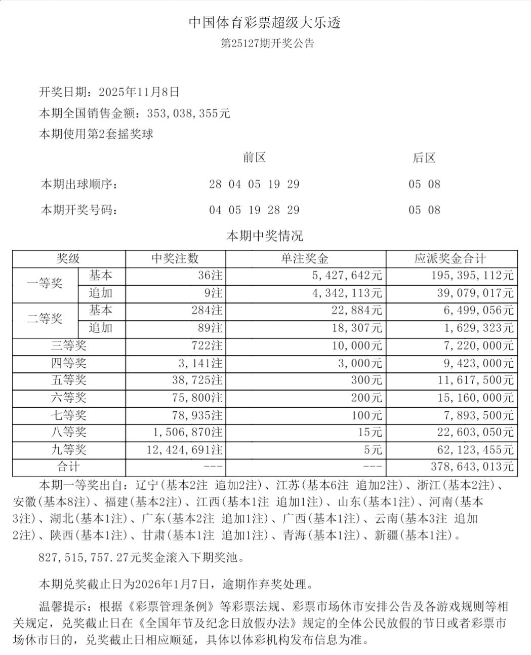 大乐透2025年第127期开奖结果以及中奖情况表。