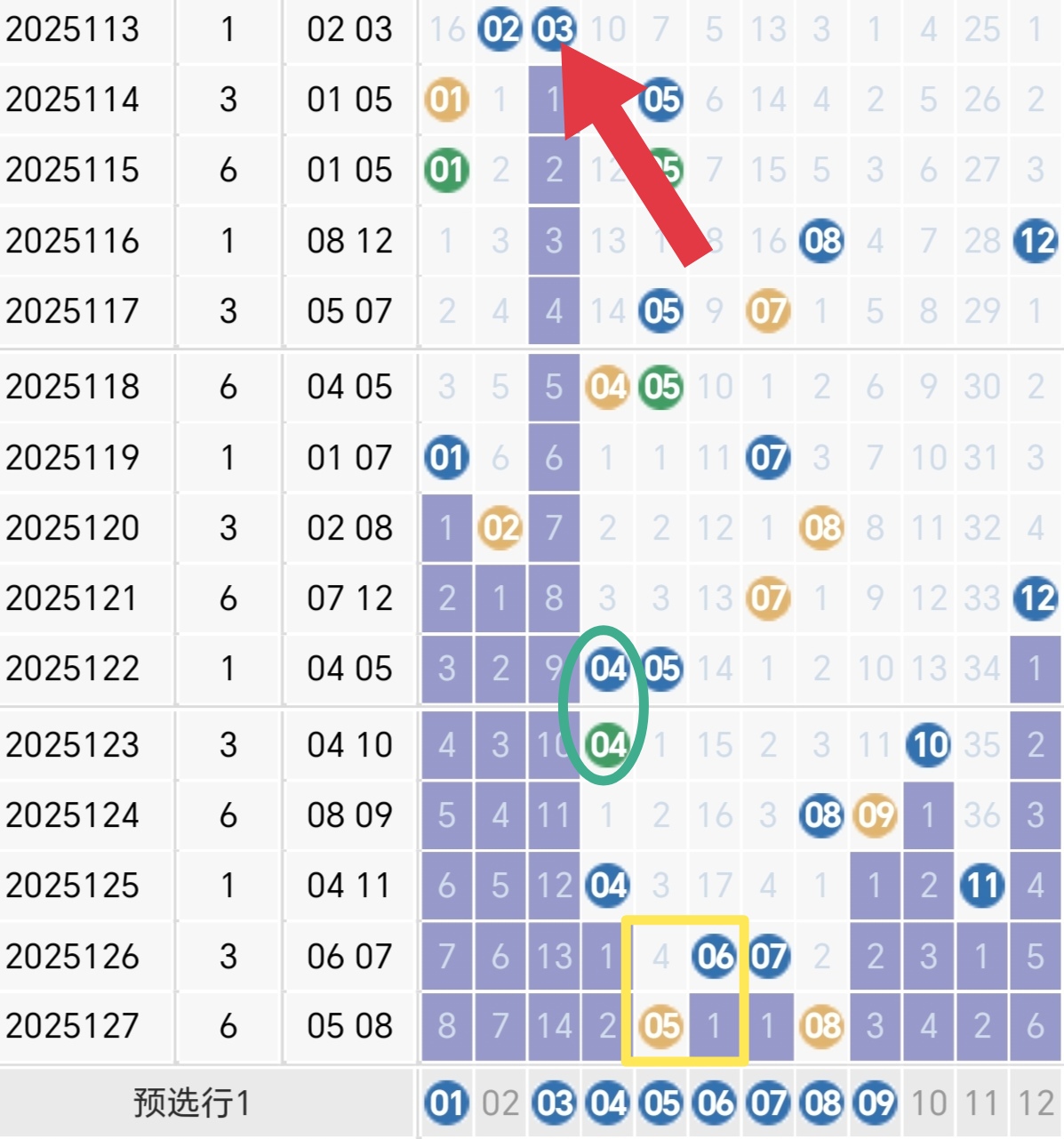 重号:连续两期或者连续两期以上开出的号码。(示例:2025年第121期与2025年第122期连续两期开出02号。)