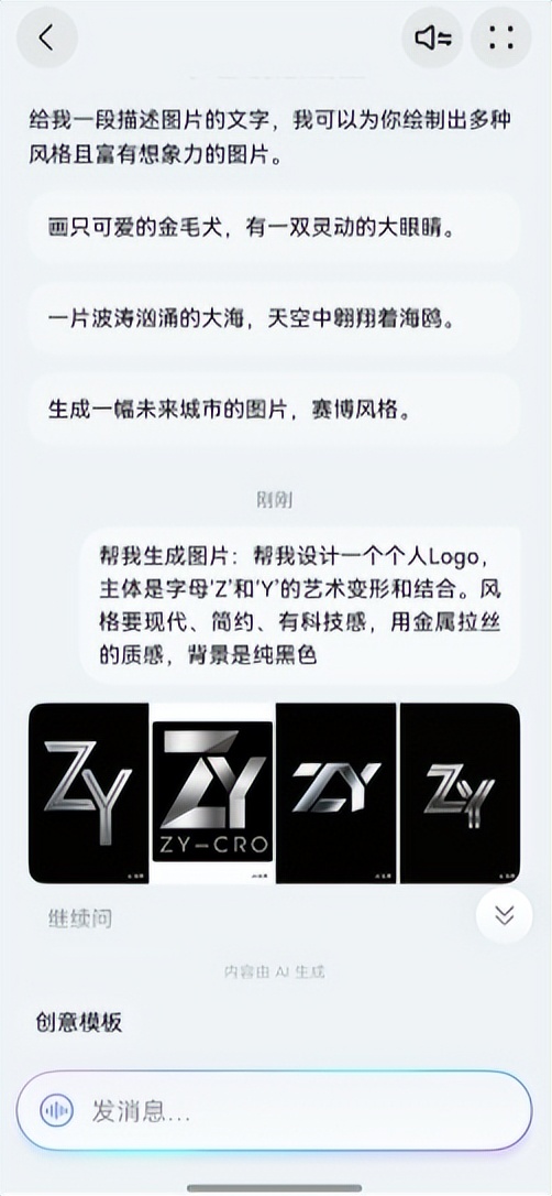 我的名字缩写是“ZY”。打开小艺后,我直接下达指令:“帮我设计个人Logo,主体是字母‘Z’和‘Y’的艺术变形和结合。风格要现代、简约、有科技感,用金属拉丝的质感,背景是纯黑色。”
