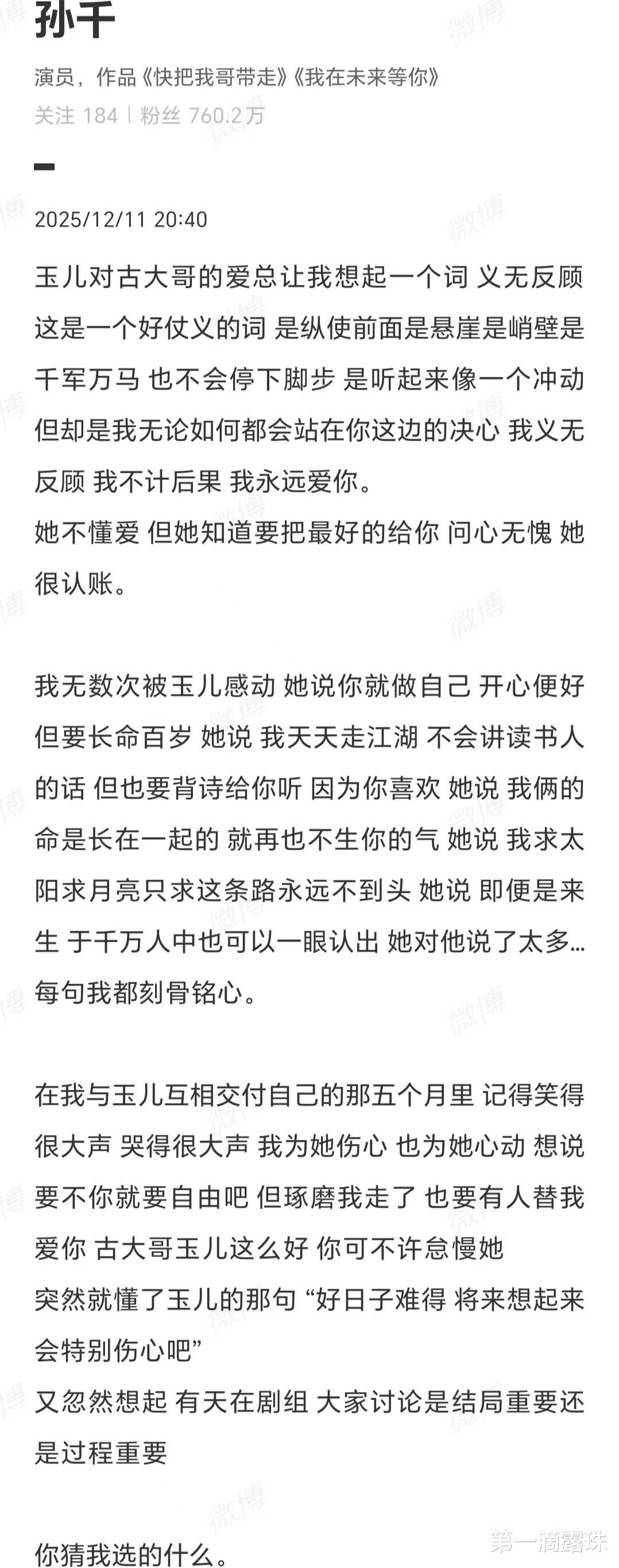 《大生意人》大结局,孙千发文告别,谈了自己对常玉儿的理解: