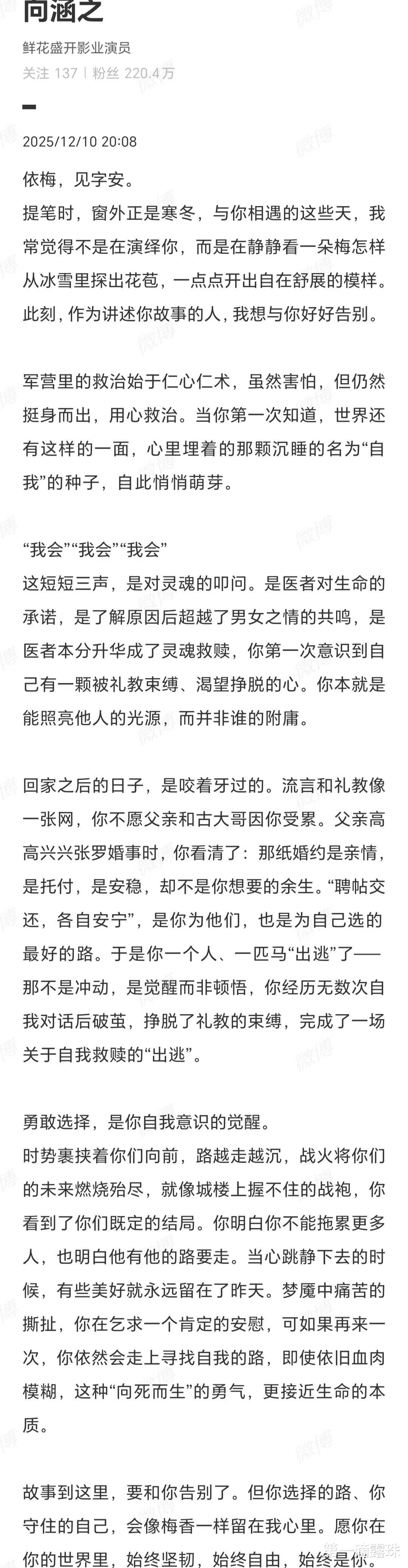 “聘帖交还,各自安宁”,是你为他们,也是为自己选的最好的路。于是你一个人、一匹马“出逃”了-那不是冲动,是觉醒而非顿悟,你经历无数次自我对话后破茧,挣脱了礼教的束缚,完成了一场关于自我救赎的“出逃”。
