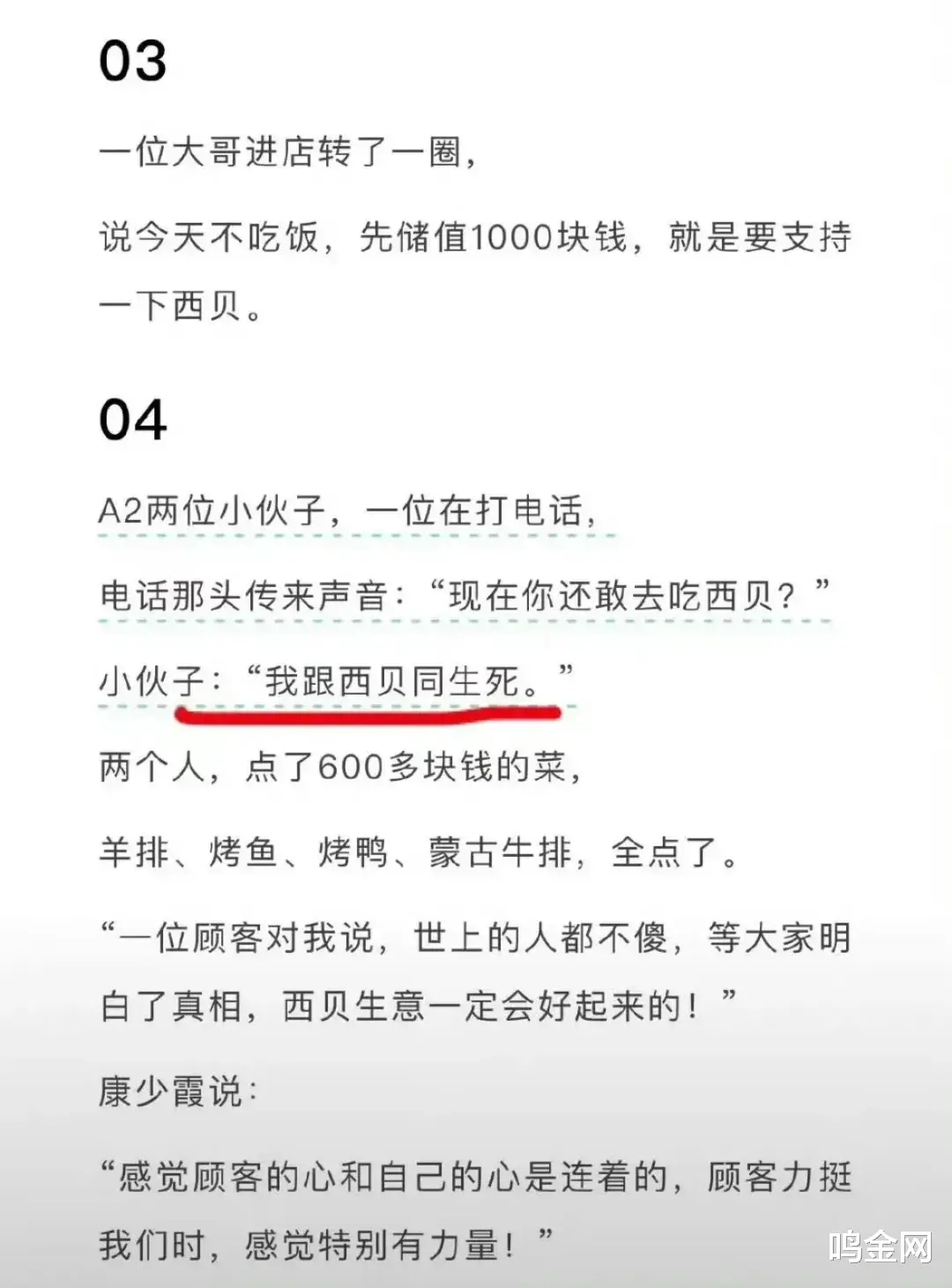 比如“顾客打电话说要跟西贝共生死”、“大哥来西贝不吃饭,先存1000块支持西贝”、“听到有人骂西贝,两人专门过来点了600块的菜”等等,一看就是满满的华与华味道,就是那个10年收了西贝6000万咨询费的公司。这一连串公关词调,很可能也是出自华与华之手,亦或者更有可能就是贾老板自己的手笔,至少这相当符合贾老板的审美。