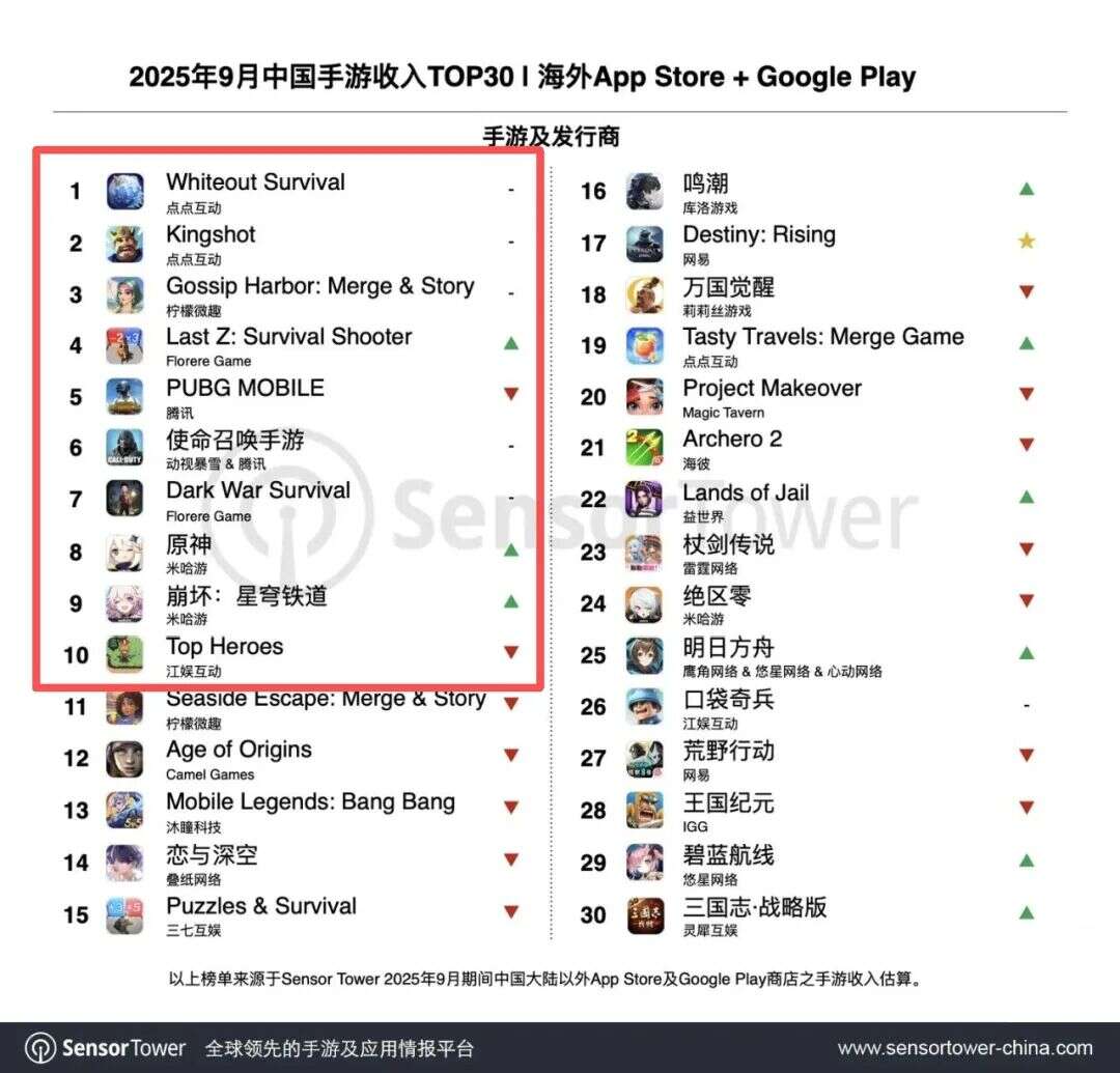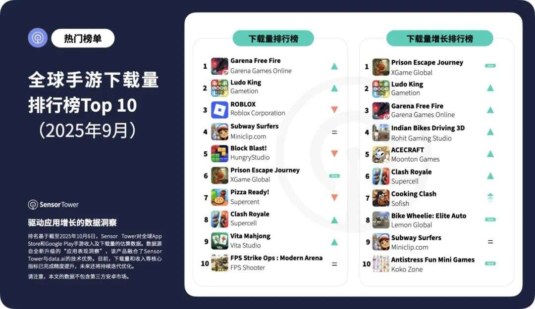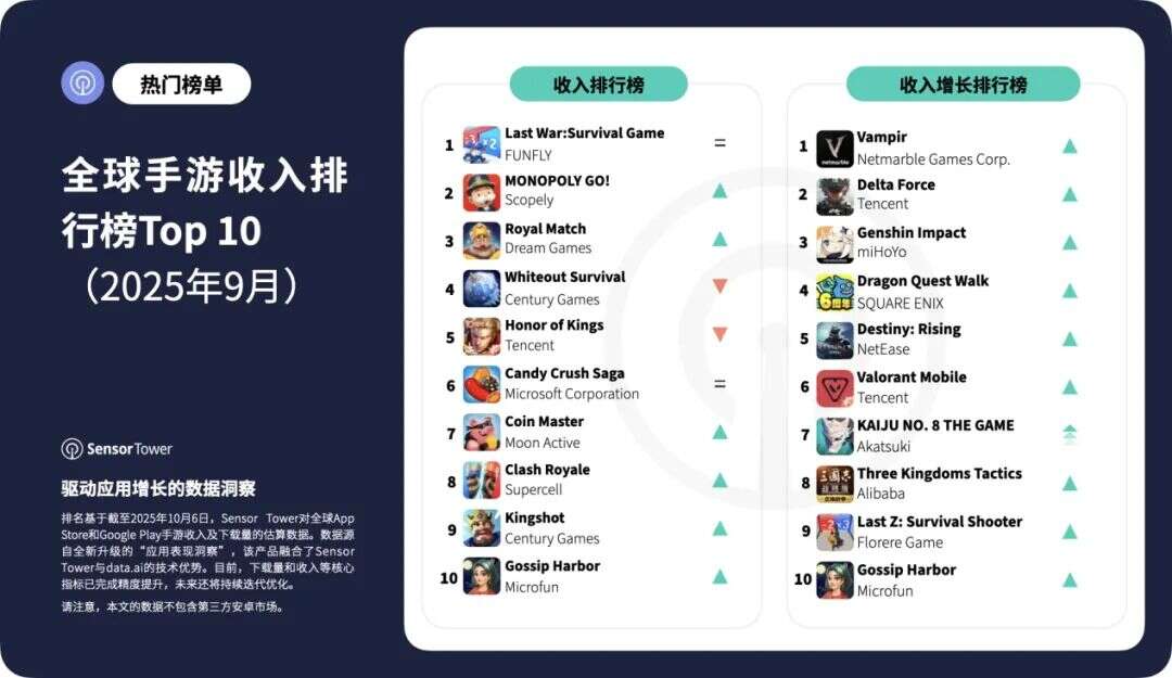 近日,Sensor Tower发布了9月全球手游收入&下载量排行榜TOP10,以及9月中国出海手游收入&下载量TOP30几张关键榜单(注:Sensor Tower的榜单不包含第三方安卓市场,仅统计Google Play及App Store数据)。
