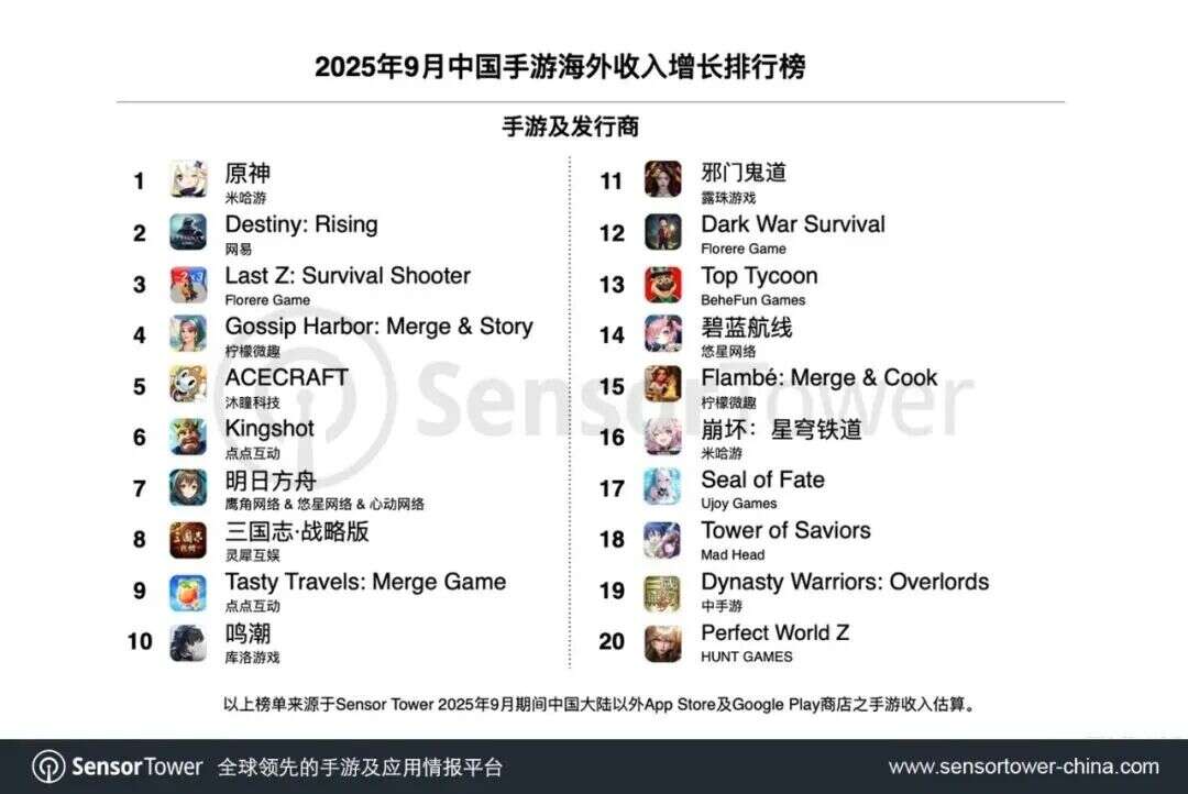 透过全球手游收入榜,我们注意到,除了《王者荣耀》这一款MOBA游戏之外,SLG和休闲类游戏几乎均分收入榜坐席,且半数都是中国出海产品。而收入增长排行榜中,二次元、FPS、MMORPG增长表现强劲,特别是FPS品类,如腾讯的《三角洲行动》《无畏契约:能源行动》、网易的《命运:群星》,分别位列收入增长榜第2、6、4名,展现出了全球玩家对射击类游戏的强烈需求。