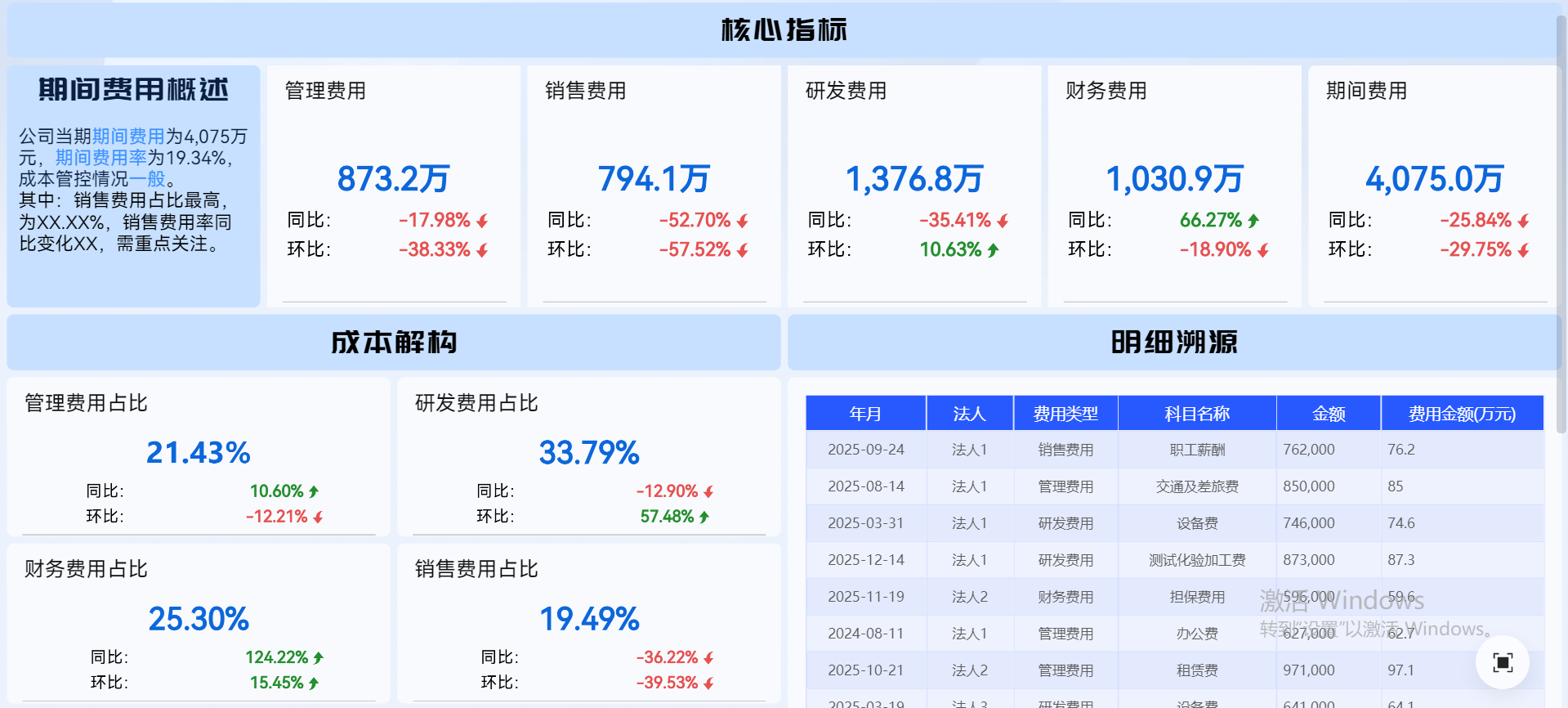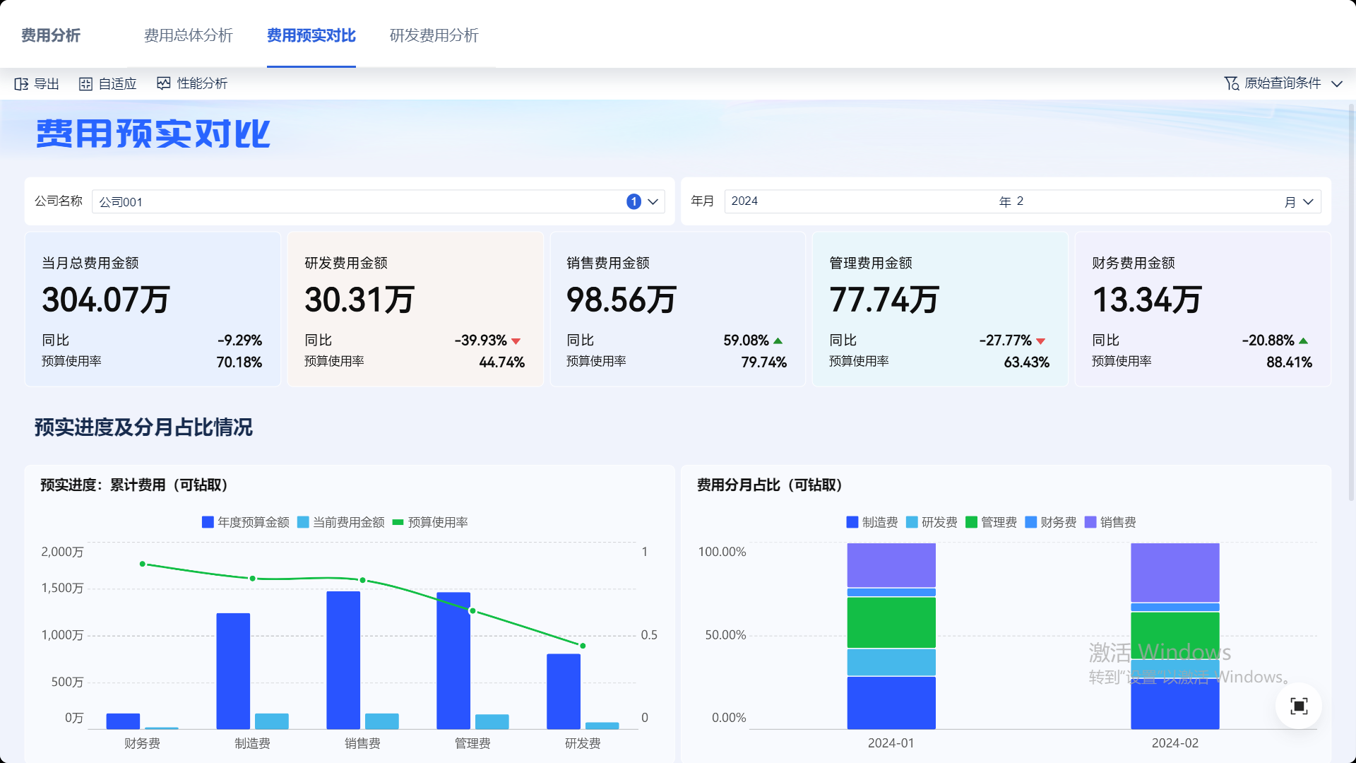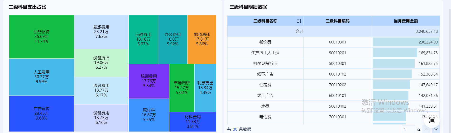 为了让大家更直观地看到这些数据,这里我就用数据分析工具FineBI来制作了这份成本分析看板图,在这份看板图上你能清楚地看到人工成本在哪些方面花了多少、花在哪些方面,是不是非常明确?在下图的费用预算上,还能对数据进行钻取操作,进一步帮助企业实现降本增效。