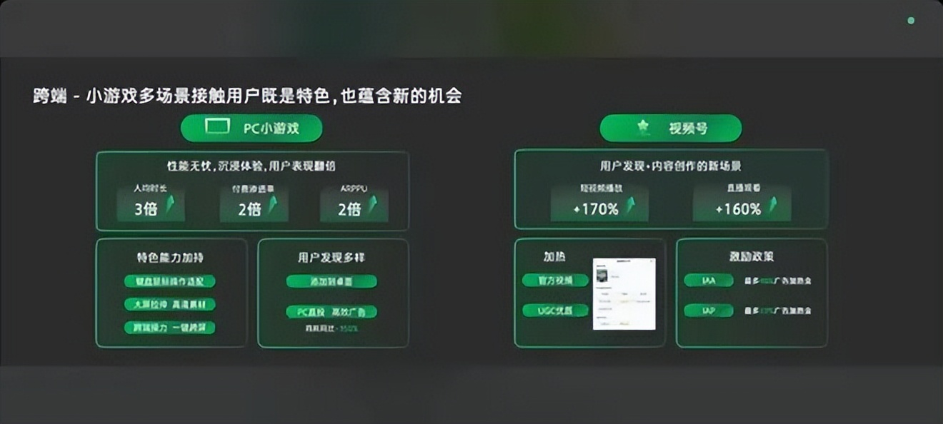 同时,微信从去年开始也在大力推广视频号与小游戏的联动。年初的数据,小游戏的带动下视频号短视频播放量提升170%,直播观看数提升160%。