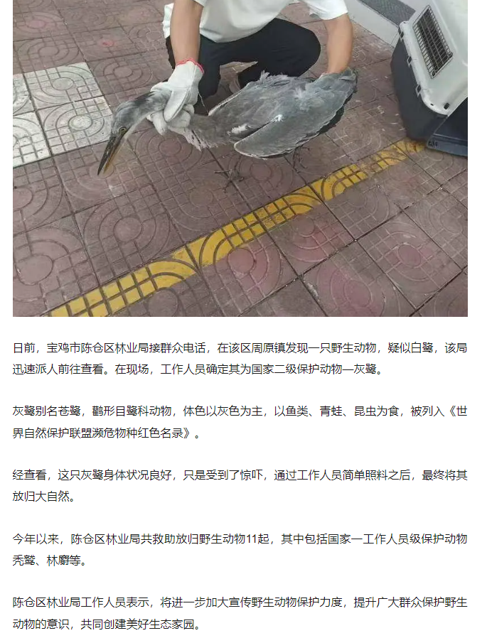 陈仓区救助国家二级保护动物灰鹭