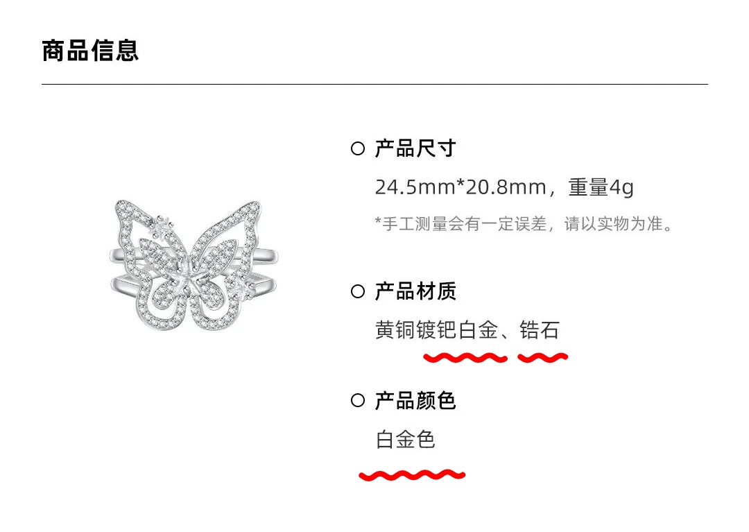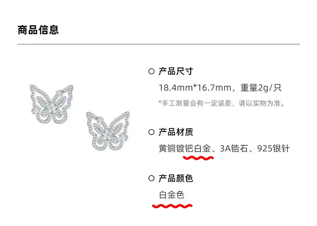 5、接下来,看下吴燕妮首饰品牌 Née Hurdles 的产品材质。即,贵金属使用是 黄铜镀钯白金、镶嵌锆石。产品颜色:为 白金色。 ——诚然,如此标注产品信息,实为不妥。即:“ 钯金就是钯金,并不是钯白金。是银色或银白色,并不是白金色。” 既然,产品材质中没有白金,就勿须出现白金字样,否则将引歧义。(根据国家标准,白金即是铂金,而传统认知又将白金理解为 k白金。)