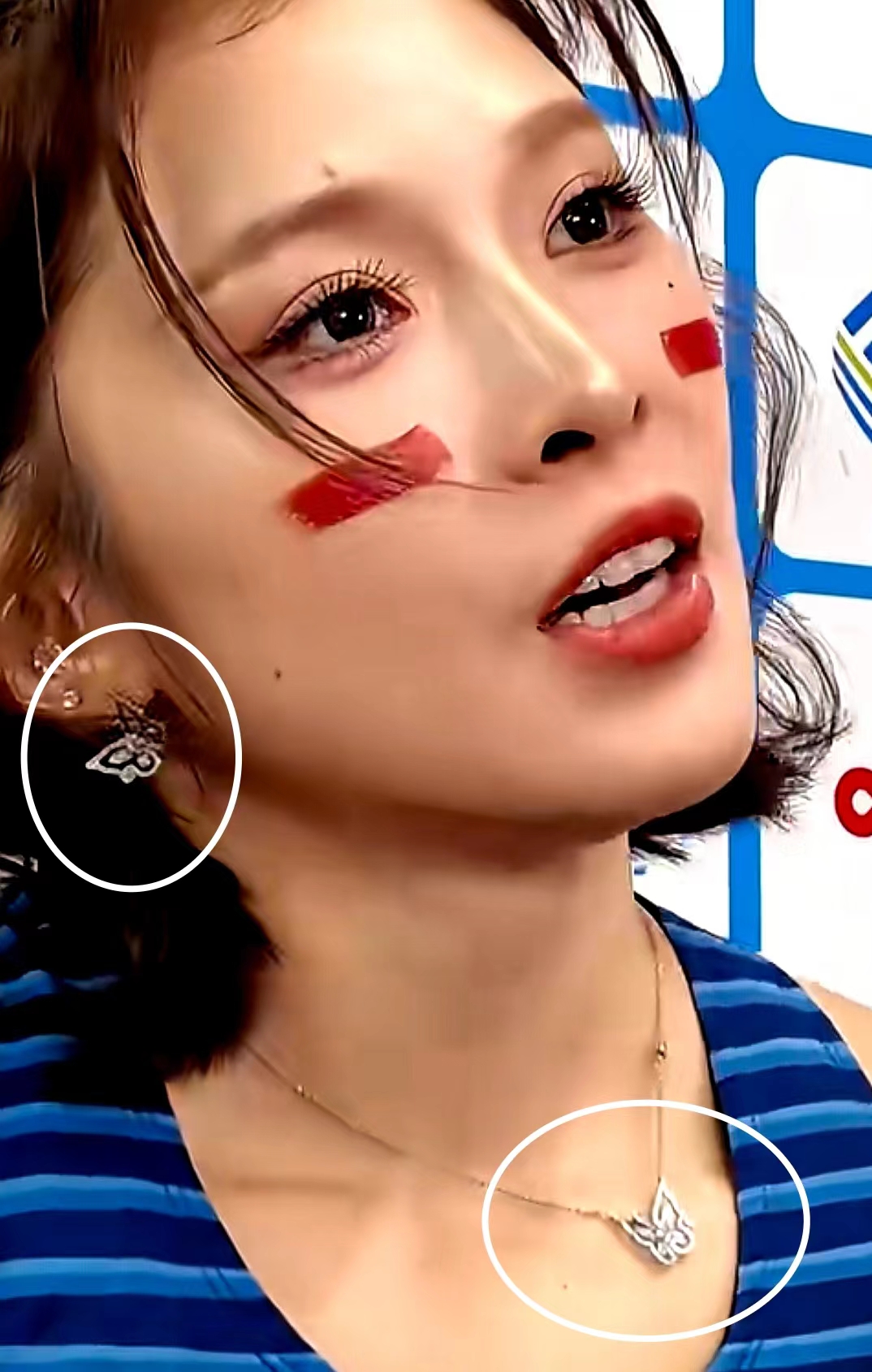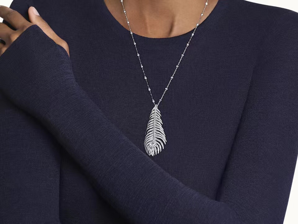 2、初见,吴燕妮在100米栏决赛中所配之首饰,笔者第一印象,即认为是吴燕妮又给“格拉夫GRAFF ”珠宝首饰做代言了。因其之前,也曾代言过其它国际珠宝品牌,例如,TIFFANY,CHAUMET,LV等。随后方知,原是其自己创立的 Née Hurdles 行韵系列:凤翎项链,凤翎耳钉。(其中,凤翎戒指和凤翎手链。则是通过查询所得。全运期间,其参加比赛,接受采访,上台领奖所戴之饰,仅为凤翎项链和耳钉。)———毫无疑问,这套凤翎首饰,即是吴燕妮首饰品牌的主打款式。