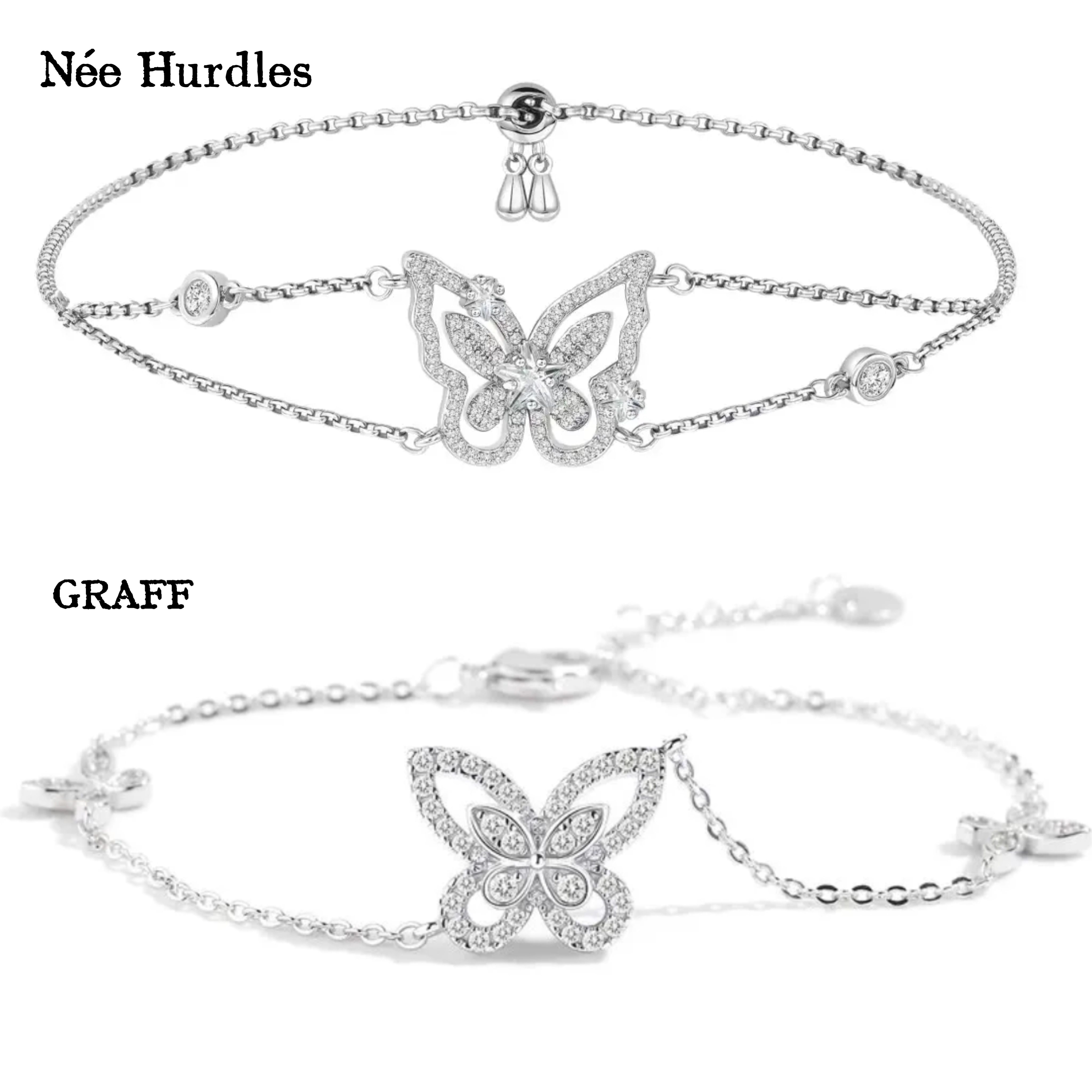 4、经此对比,Née Hurdles 凤翎系列的款式设计,与GRAFF 蝴蝶幻影系列的款式设计,还是具有较明显的造型区别的。尤其是”凤翎手链”的款式设计,则与“蝴蝶手链的款式设计”迥然不同。( 扪心而论,从吴燕妮佩戴之凤翎项链和耳钉来看,Née Hurdles 的蝴蝶造型,相比更具振翅飞翔的灵动之美。)