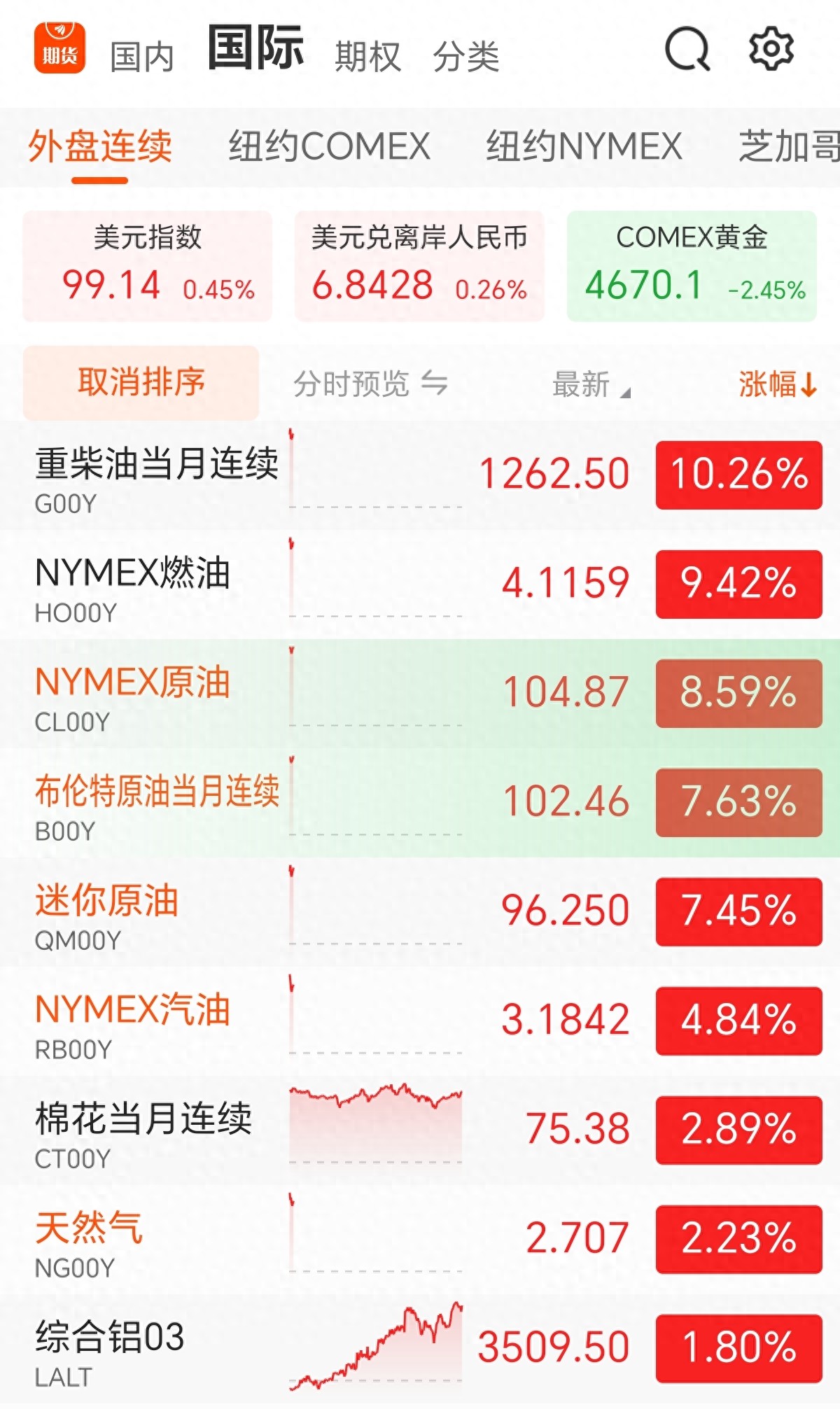 涨幅榜: 重柴油当月连续暴涨10.26%,NYMEX燃油9.42%,NYMEX原油8.59%,布伦特原油7.63%,汽油4.84%,天然气2.23%。