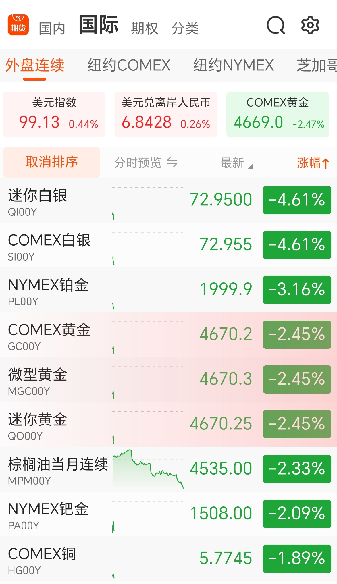 跌幅榜: 迷你白银暴跌4.61%,COMEX白银4.61%,NYMEX铂金3.16%,COMEX黄金2.48%,钯金2.09%,棕榈油2.33%,COMEX铜1.89%。