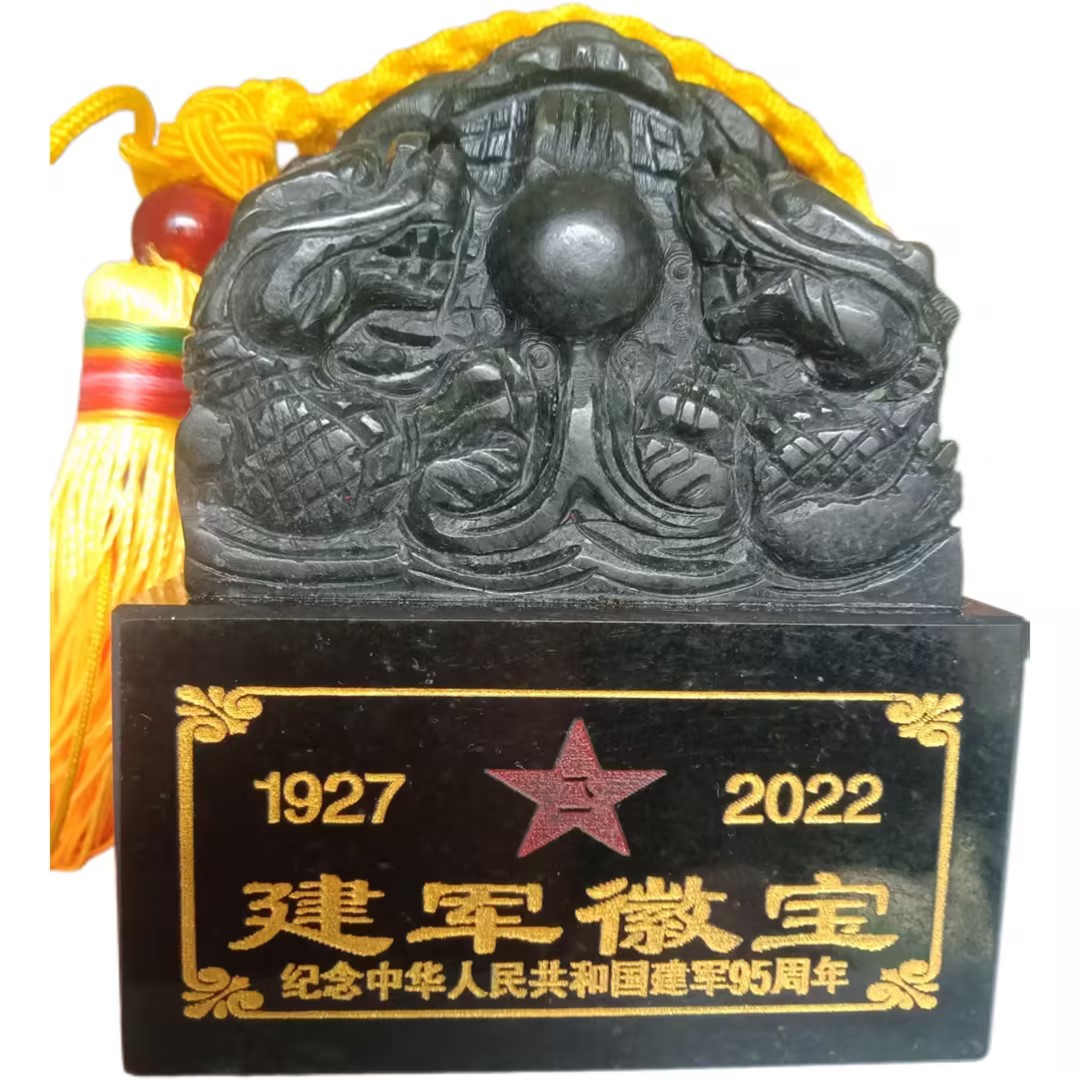 印的形制是 **“龙钮 + 方印” 的纪念规格 **:顶部龙钮雕工饱满,双龙拱珠的造型象征 “团结强军、守护家国”;印身方正厚重,符合传统玺印 “天圆地方” 的文化寓意;底座刻着 “1927-2022 建军徽宝 纪念中华人民共和国建军 95 周年” 的字样,直接锚定了它的 “时代纪念属性”。