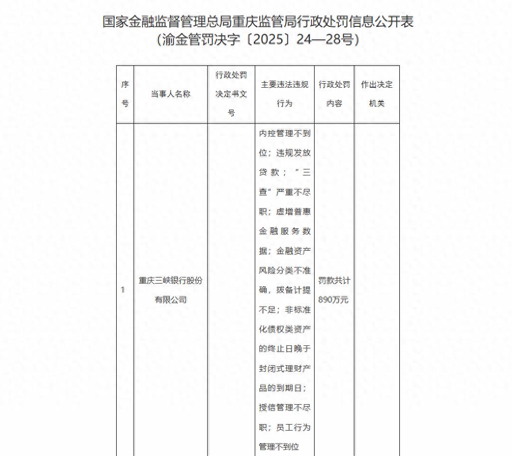近日,重庆金融监管局披露的罚单显示,重庆三峡银行因内控管理不到位;违规发放贷款;“三查”严重不尽职;虚增普惠金融服务数据;金融资产风险分类不准确,拨备计提不足;非标准化债权类资产的终止日晚于封闭式理财产品的到期日;授信管理不尽职;员工行为管理不到位等,被罚款共计890万元。