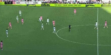 第71分钟,温哥华后场有点拖沓,后卫脚下犹犹豫豫想多做一步调整。就在他犹豫那一瞬间,梅西突然上抢,直接完成断球,转身就是一脚直塞,把球塞进右侧肋部空挡。