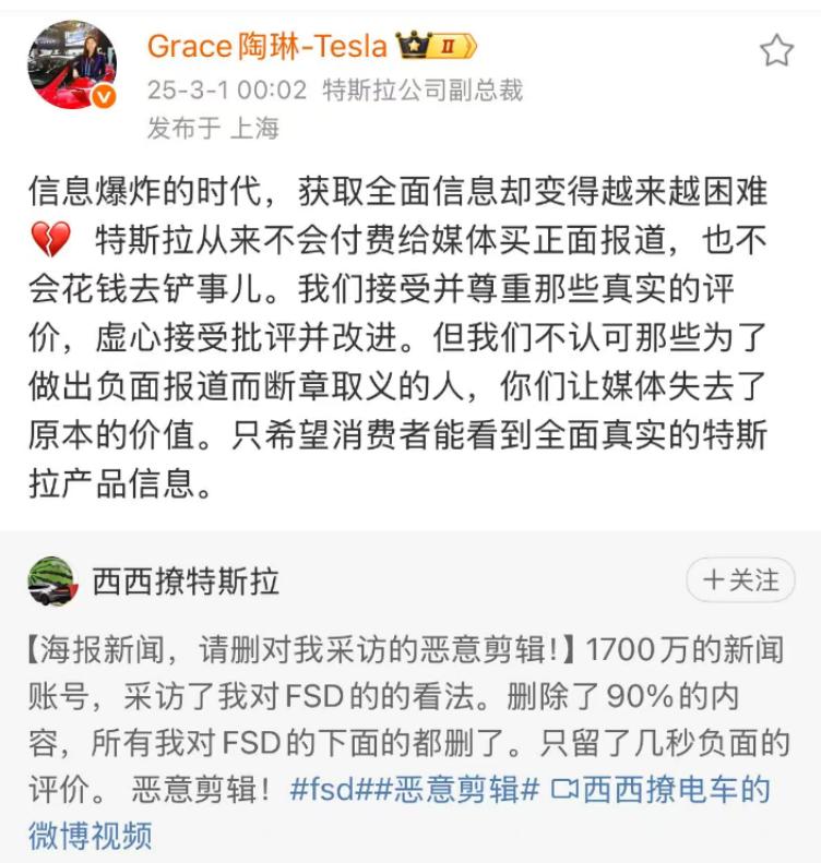 陶琳曾公开表示“不会花钱去铲事儿,接受并尊重那些真实的评价,虚心接受批评并改进。但不认可断章取义的负面报道,让媒体失去原来的价值。”而陶琳的态度,正是代表了特斯拉的态度,甚至是马斯克的态度。