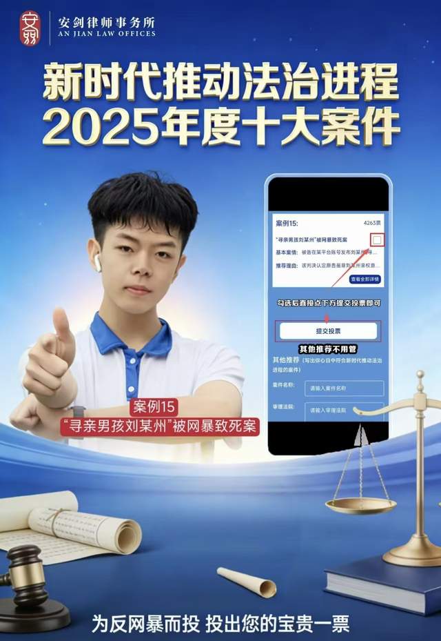 “刘学州被网暴致死案的每一票,都在为打造清朗网络空间投票!” 随着2025年“新时代推动法治进程十大案件”投票进入关键阶段,刘学州案票数即将冲破40万大关、稳居前十,作为被誉为国民律师曾经案件代理律师周兆成,再次在社交平台上发出恳切呼吁——邀全民聚力冲刺50万票,让这起承载无数人痛与盼的反网暴里程碑案件,成为推动《反网暴法》落地的“法治引擎”。