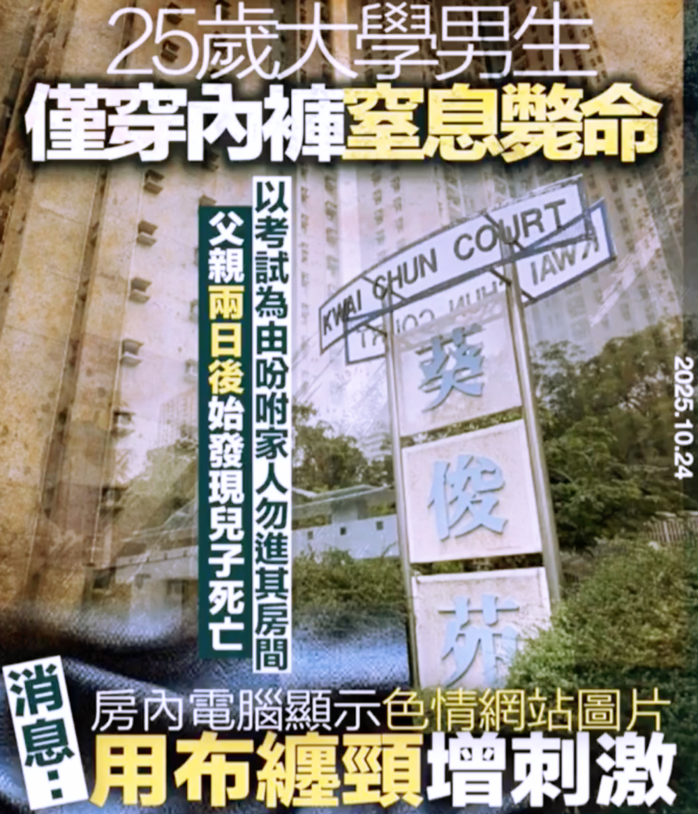 让人窒息的是,在进一步的报道中,媒体直接点名死者姓黄,为香港一所大学二年级学生,与家人同住于葵俊苑。并且关于死前和死后情况,媒体也进行了详细描述,指出:“10月21日晚8时许,黄某曾告知妹妹自己要准备考试,嘱咐不要进房打扰。此后数日家人未再见到其露面。直至23日傍晚6时许,黄父因多日未见儿子,开门查看,惊见儿子仅穿内裤、颈部缠绕一条蓝色布条昏迷不醒,电脑屏幕上仍显示某色情网站画面,立即报警求助。”