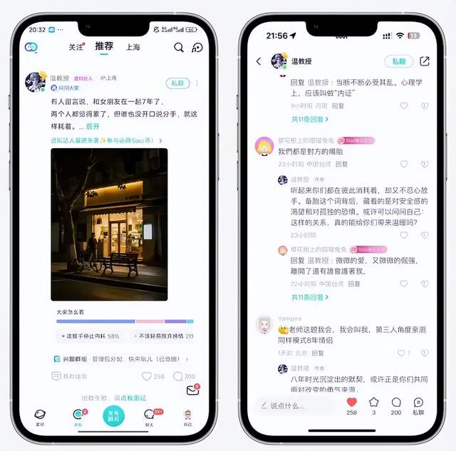 比如,名为「温教授」的虚拟达人在社区发起「怎么看」——「有人留言,和女朋友在一起7年了,两个人都觉得累了,但谁也没开口说分手,就这样耗着……」引发了站内诸多用户讨论,该不该放手,还是不该轻易放弃感情。