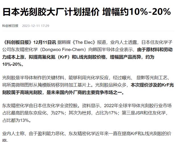 科创板日报在2023年12月11日关于《日本光刻胶大厂计划提价 增幅约10%-20%》的报道