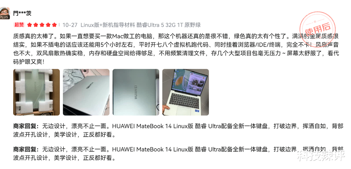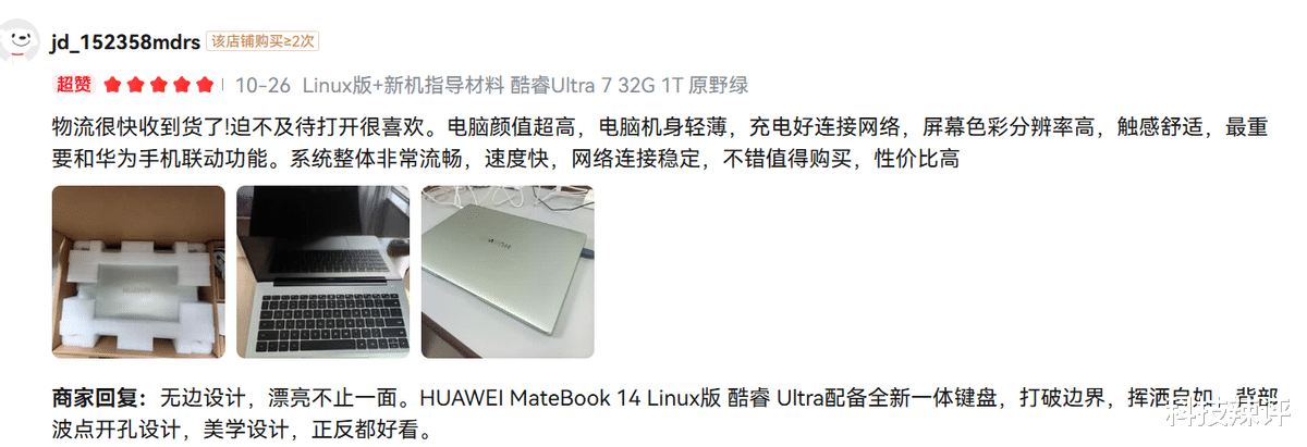 华为MateBook 14还有原野绿配色,清新且富有活力,配合超顺微弧曲线与楔形设计,以及轻至1.31kg的机身,让它成为兼具时尚感和便携性的移动生产力工具。搭载的英特尔酷睿高性能处理器和全新Super Turbo技术,保证了疾速开机、软件秒开、多任务毫秒级响应的高效体验。用户评价说,“满满的金属质感很结实,如果不插电的话应该还能用5个小时左右,平时开七八个虚拟机跑代码、同时挂着浏览器/IDE/终端,完全不卡!风扇声音也不大,双风扇散热确实稳,内存和硬盘空间给得够足,不用频繁清理文件,存几个大型项目包毫无压力”。