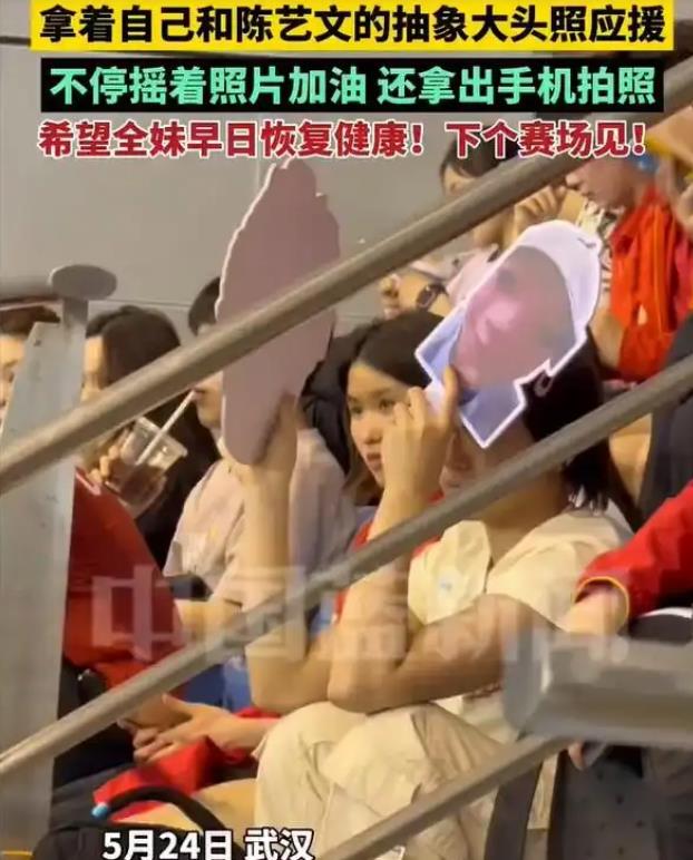 全红婵化身热情拉拉队,手中拿着衬衣稳定大头照,给同是广东队的陈艺文加油鼓励,为广东队加油助威。