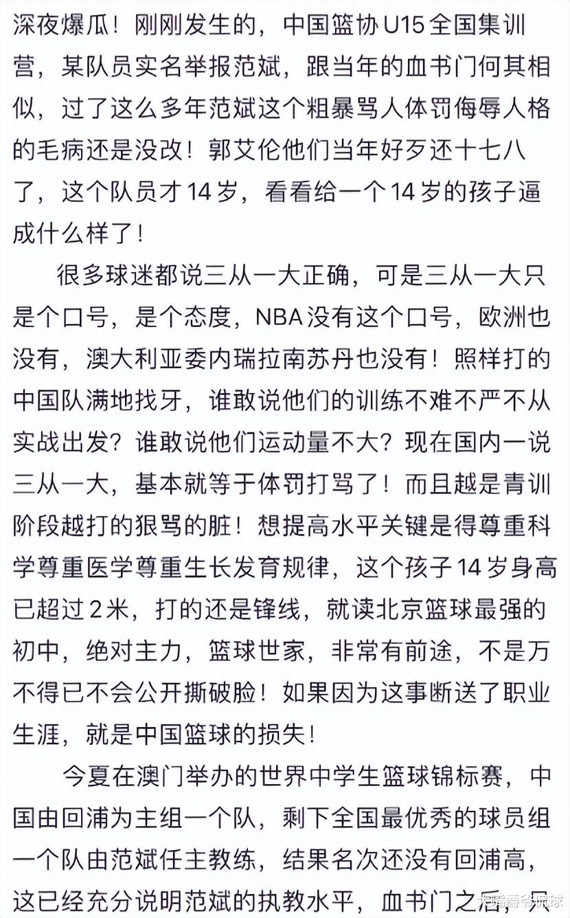 这名球员在这叫媒体上发表了一篇长文,文章中写道,范斌希望该球员少跟自己的妈妈交流,毕竟后者已经14岁了,否则就会成为妈宝男。