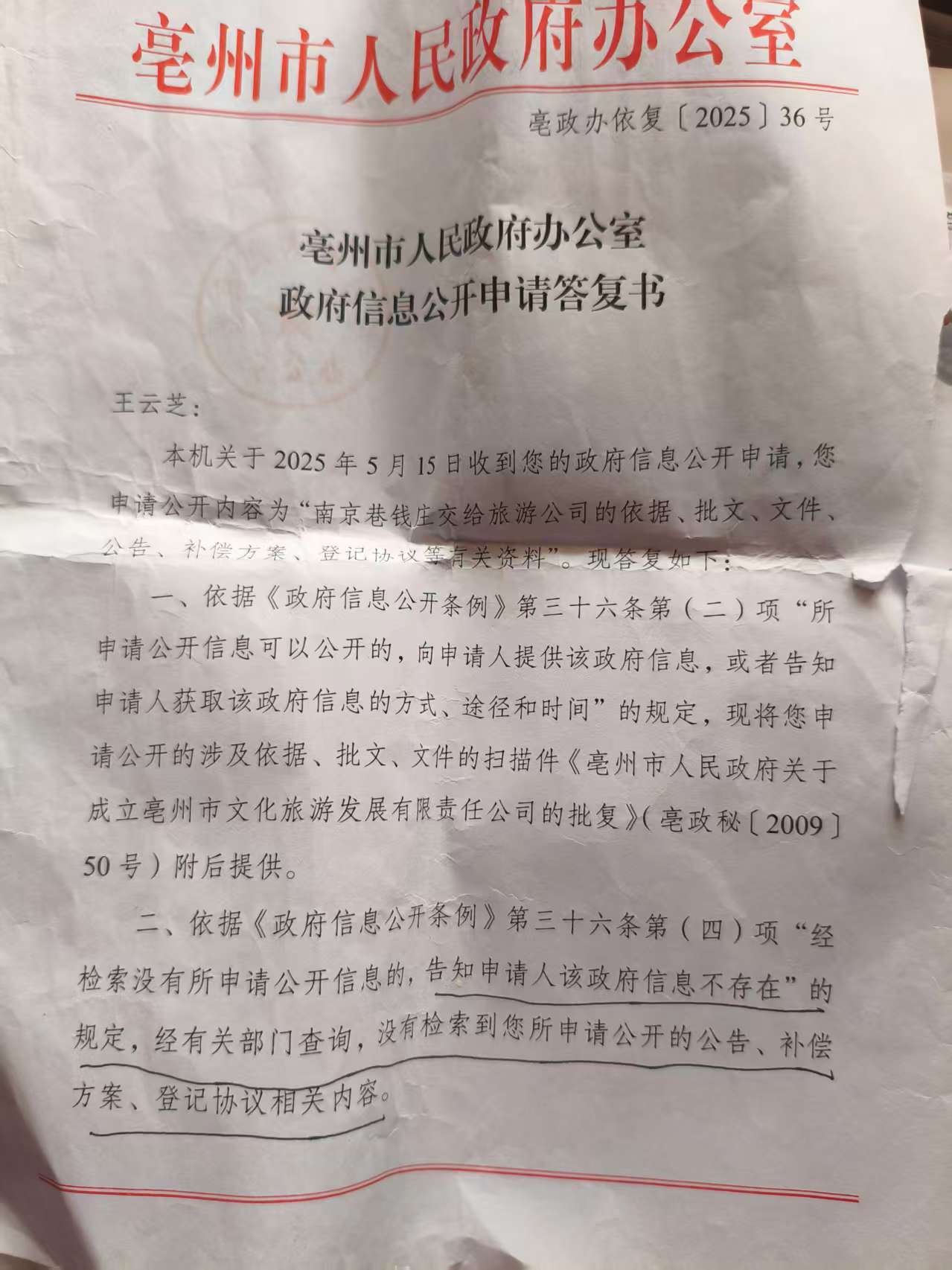 但根据《政府信息公开条例》第三十六条第(四)项规定,经有关部门查询,没有检索到王女士所申请公开的公告、补偿方案、登记协议相关内容。政府对于征用南京巷钱庄的回复,没有经过任何法律依据和手续,仅仅是几个单位开会研究一下,就交给了文旅公司,显然是有问题的!