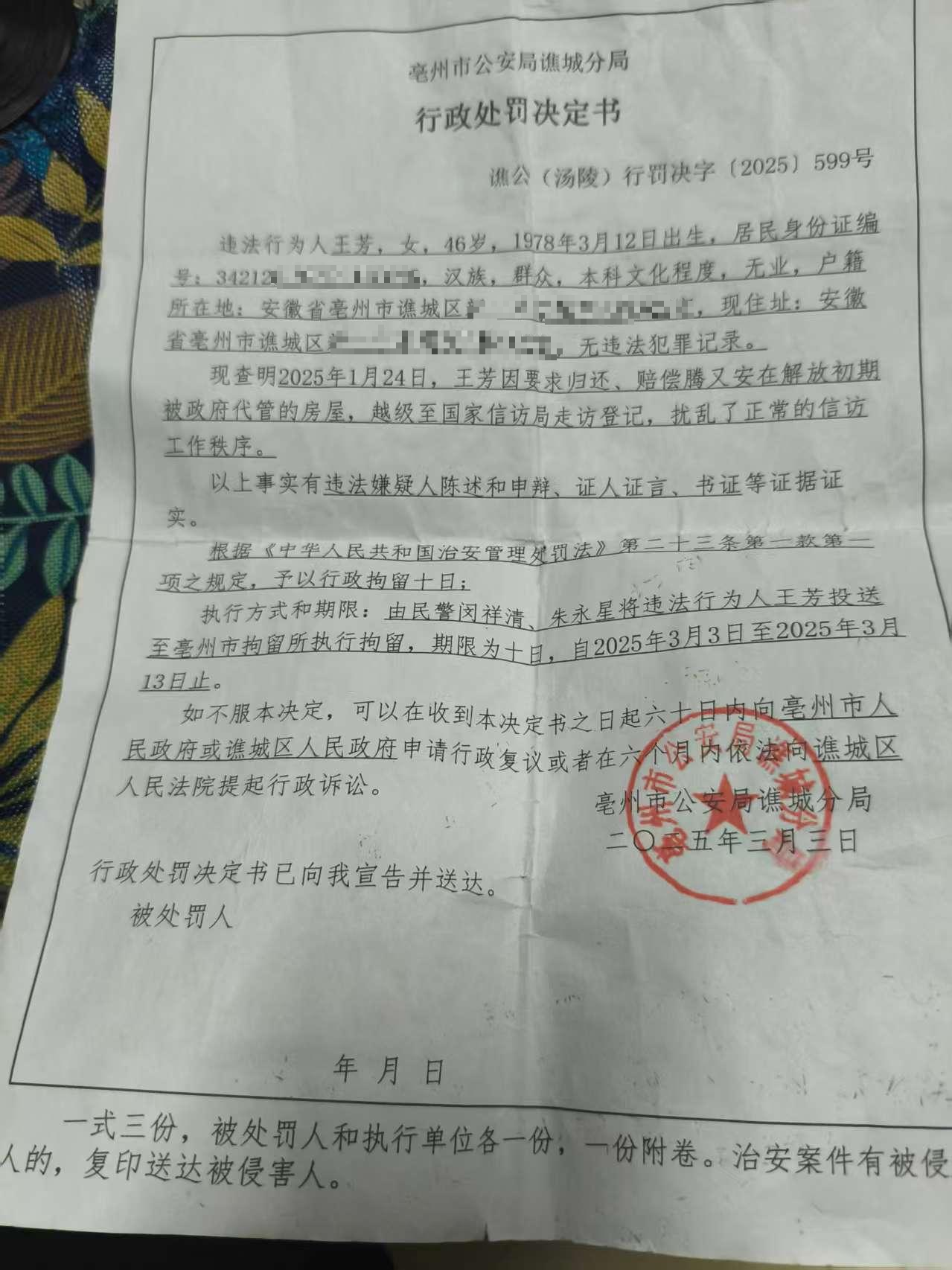 越级信访遭拘留在维权无果的情况下,王女士女儿于2025年1月24日越级至国家信访局走访登记,要求归还、赔偿腾又安在解放初期被政府代管的房屋。但被亳州市公安局认定为扰乱了正常的信访工作秩序,对王女士女儿予以行政拘留十日。