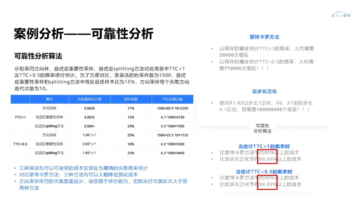 对于评价系统的可靠性,如航天以及智能辅助驾驶系统等,从系统失效概率角度衡量其安全性,例如:当被测系统失败概率为10−5时,被测系统被视为不可靠;而当被测系统失败概率降至10−7甚至更低时,被测系统方被认定为可靠。假设某被测系统要求达到10−7的可靠度,若采用均匀蒙特卡洛采样方法进行验证,所需样本量需超过 107 级别。然而,即便对于每日可处理千万公里仿真的平台而言,如此庞大的样本量也难以实现有效验证。因此,我们需要采用少量样本点实现对测试空间的有效覆盖,可运用自适应采样、方向采样等算法,并根据不同算法进行迭代,构建多样化的分析算法体系。