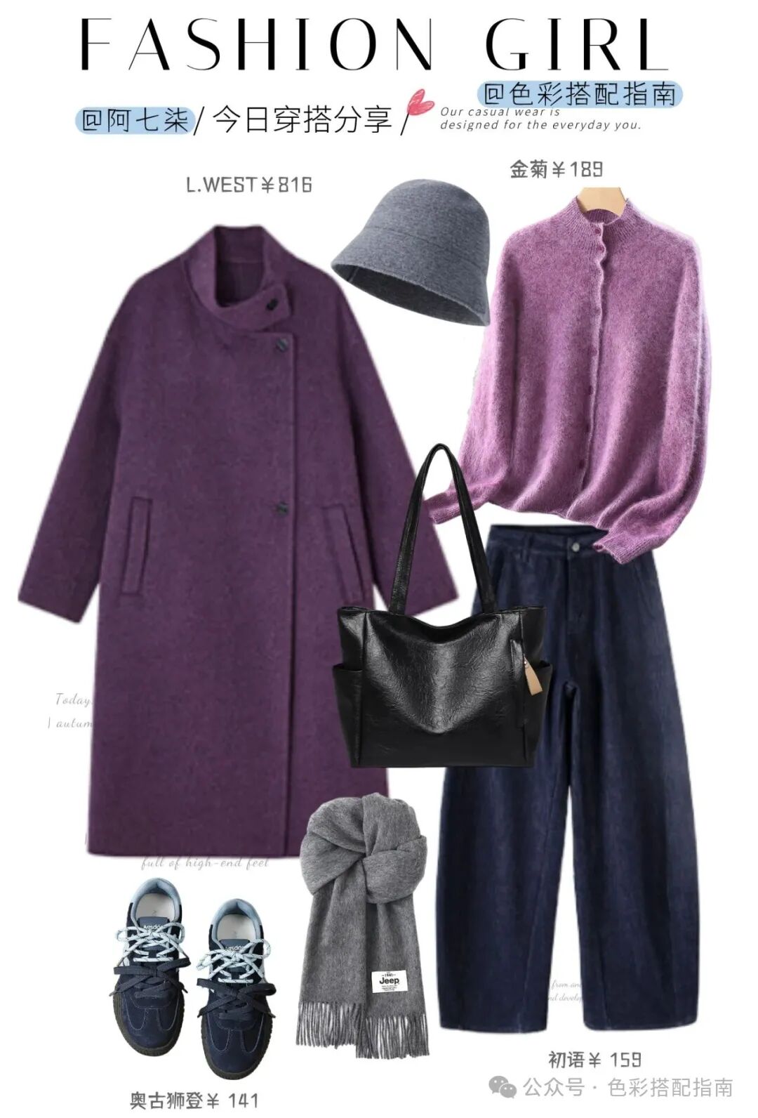 背一个黑色牛皮托特包,方正廓形平衡全身柔软。围一条灰调围巾,与同色渔夫帽呼应,像为这幅紫蓝画卷,轻轻裱上雾灰色的边。