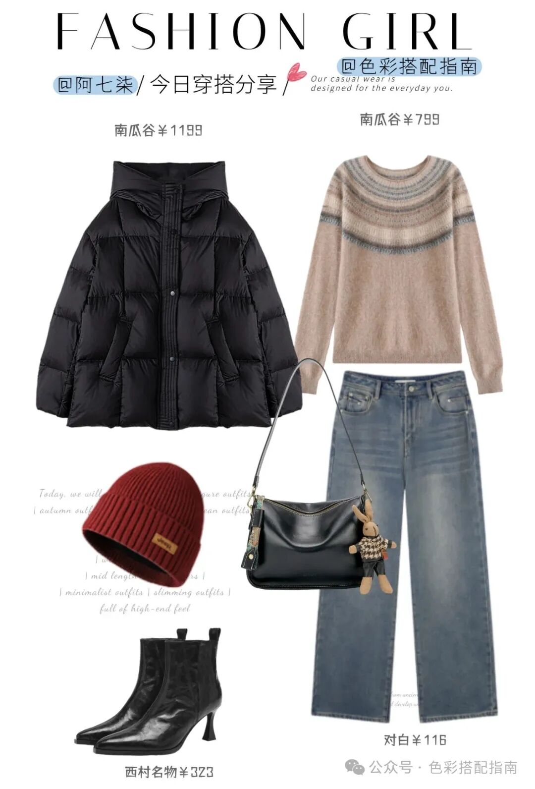 脚下一双黑色细跟短靴,是恰到好处的利落笔触——既撑起了气场,又不过分张扬。手里挽一只黑色包包,红帽一点缀,像是雪地里忽然亮起的小小火苗,不是灼人的艳,是暖洋洋的喜气。