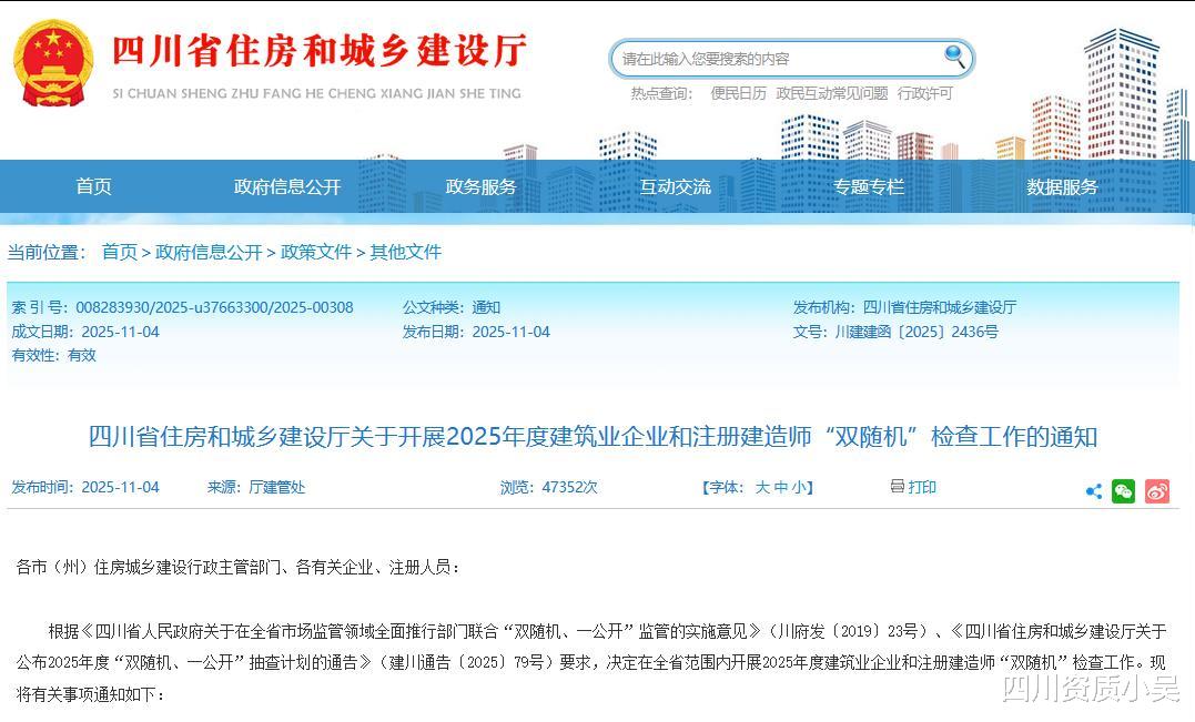 政策风向:动态核查正在“常态化、精准化、联动化”2025年11月份,四川省住房和城乡建设厅发布“关于开展2025年度建筑业企业和注册建造师“双随机”检查工作的通知”。