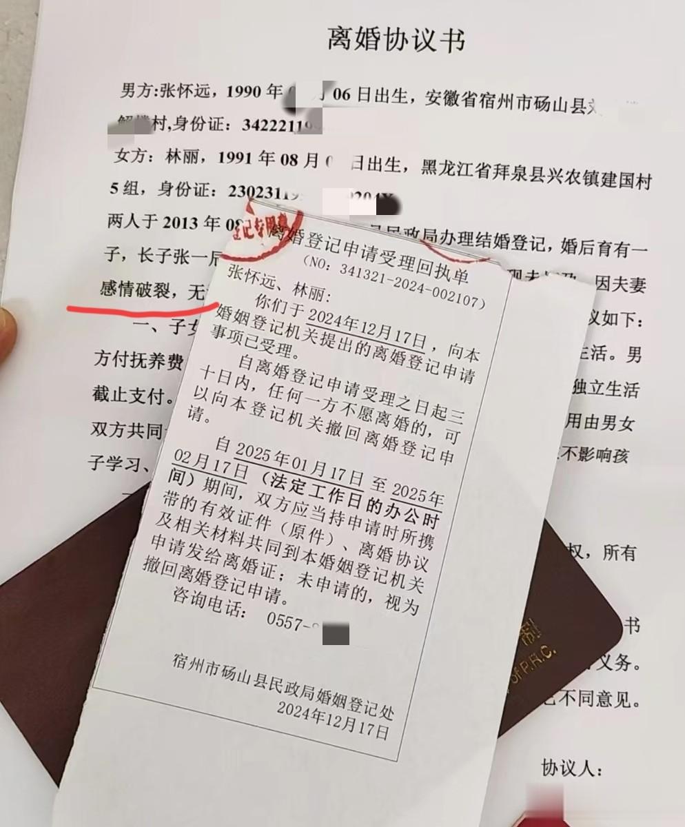 厉怀远还晒出了2025年初的离婚协议书,离婚原因是夫妻感情破裂。
