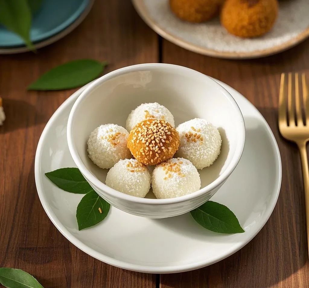 07.最后,将糯米糍放入椰浆中轻轻滚动,使其表面均匀裹上一层椰浆,即可食用。