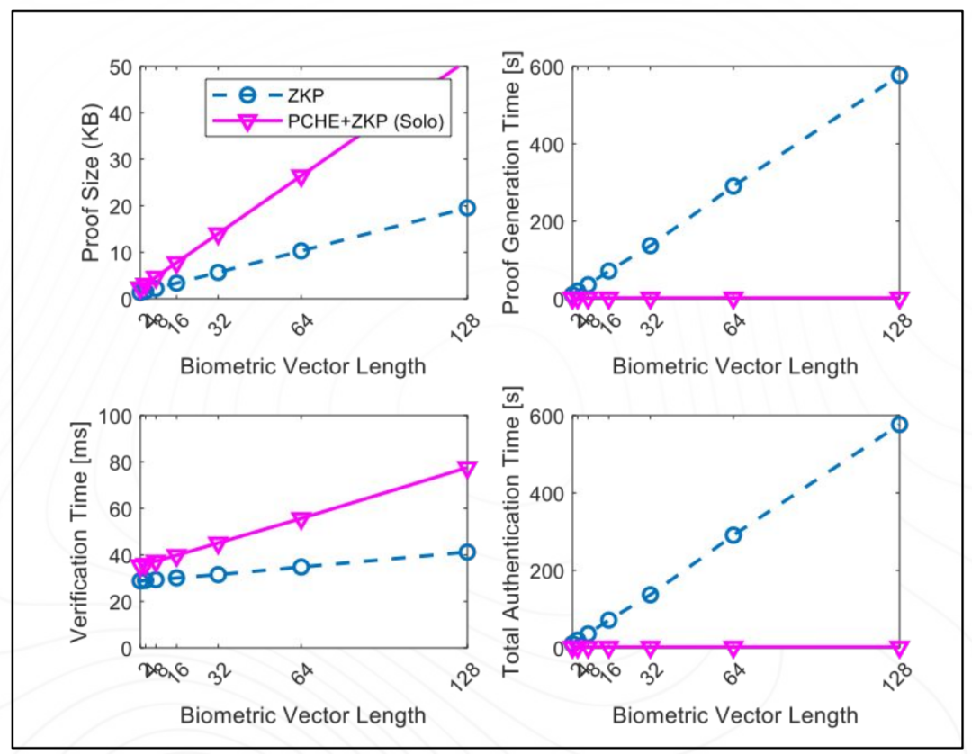 前不久 Solo 团队曾对其密码学模型进行了实验如下图所示,在面对更高维度的生物特征数据(Biometric Vector Length)时,Solo 所采用的 zkHE 架构(HE + ZKP)在证明生成时间和总认证耗时上远优于传统 ZKP 方案。在 128 维数据条件下,传统 ZKP 的认证时间超过 600 秒,而 Solo 方案则几乎不受影响,始终保持在数秒级别内。