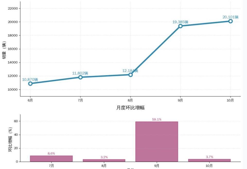 进入10月,深蓝S05在高基数之上再攀新高,全球销量突破2万辆大关,达到20101辆。从6月的1.09万辆到10月的2.01万辆,始终保持破万的稳定输出,这样的增长充分彰显了其作为销量担当的硬实力。
