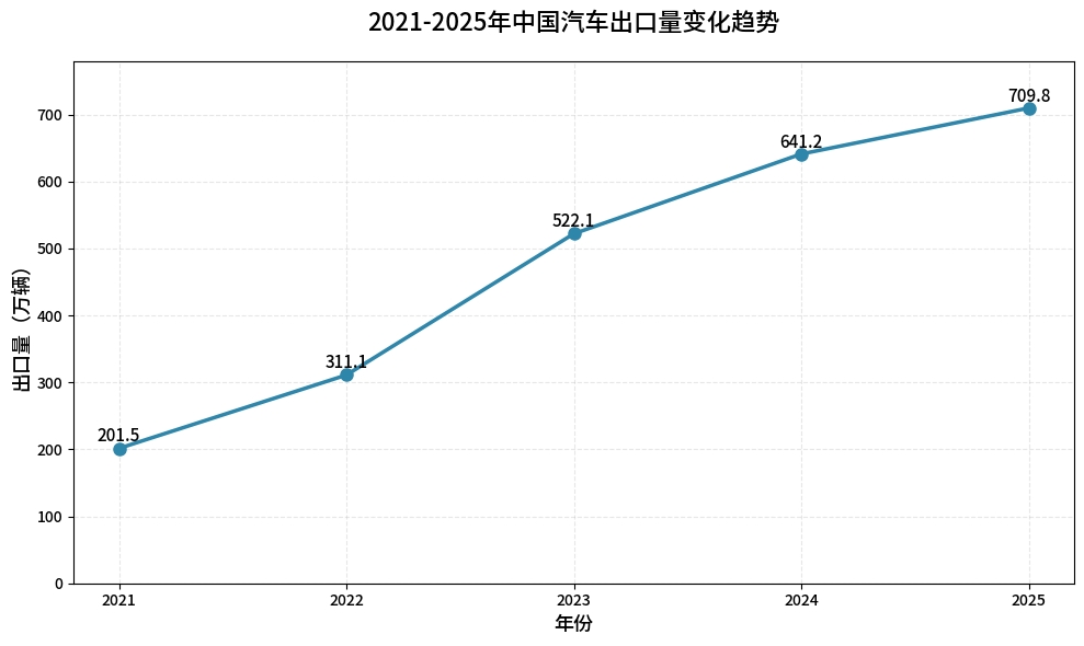 2021-2025年中国汽车出口量变化趋势