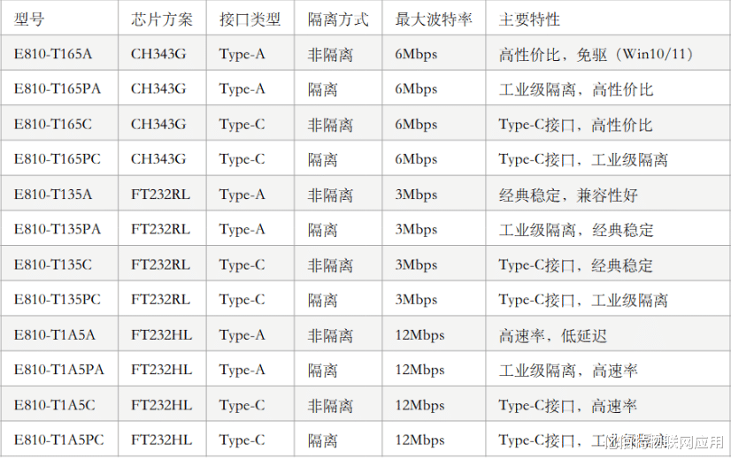 E810-T1x系列是成都亿佰特电⼦科技有限公司专为⼯程师、开发者及电⼦爱好者设计的⼀款⾼性能、多功能USB转TTL串口转换器模块。提供了从⾼性价⽐到⾼速低延迟的多种选择。该产品有多种芯片方案可供选择:CH343G、FT232RL、FT232HL,满⾜不同性能与成本需求。