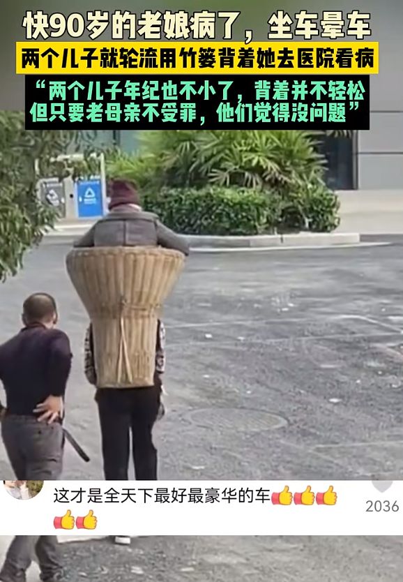 但她有两个儿子,他们决定不让母亲受到任何的罪。尽管两人年纪也不小了,但他们决定轮流用竹篓背着母亲去医院。这并不是一件轻松的事,但只要能让母亲少受一些罪,他们都觉得值得。