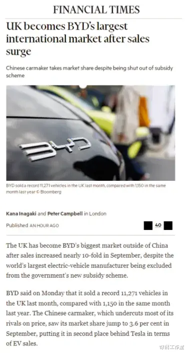 《金融时报》:英国销量飙升,成为比亚迪最大的国际市场
