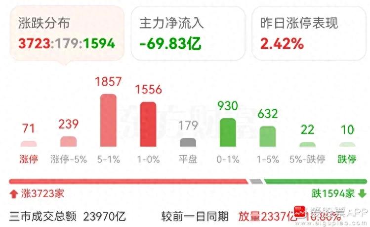 个股3723家上涨,中位数+0.63%,赚钱效应还凑合。两市成交额2.39万亿,放量2300多亿,增量资金也非常的猛!