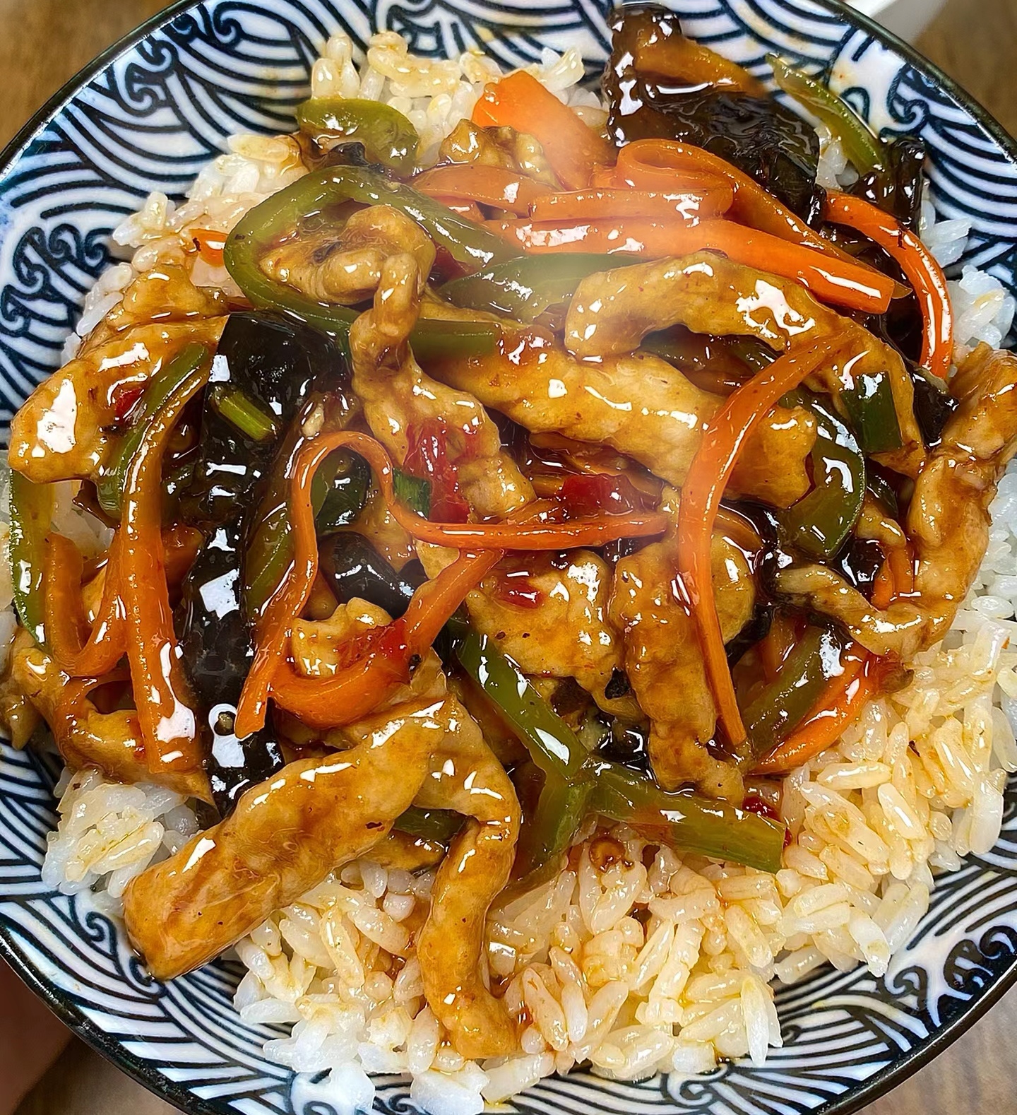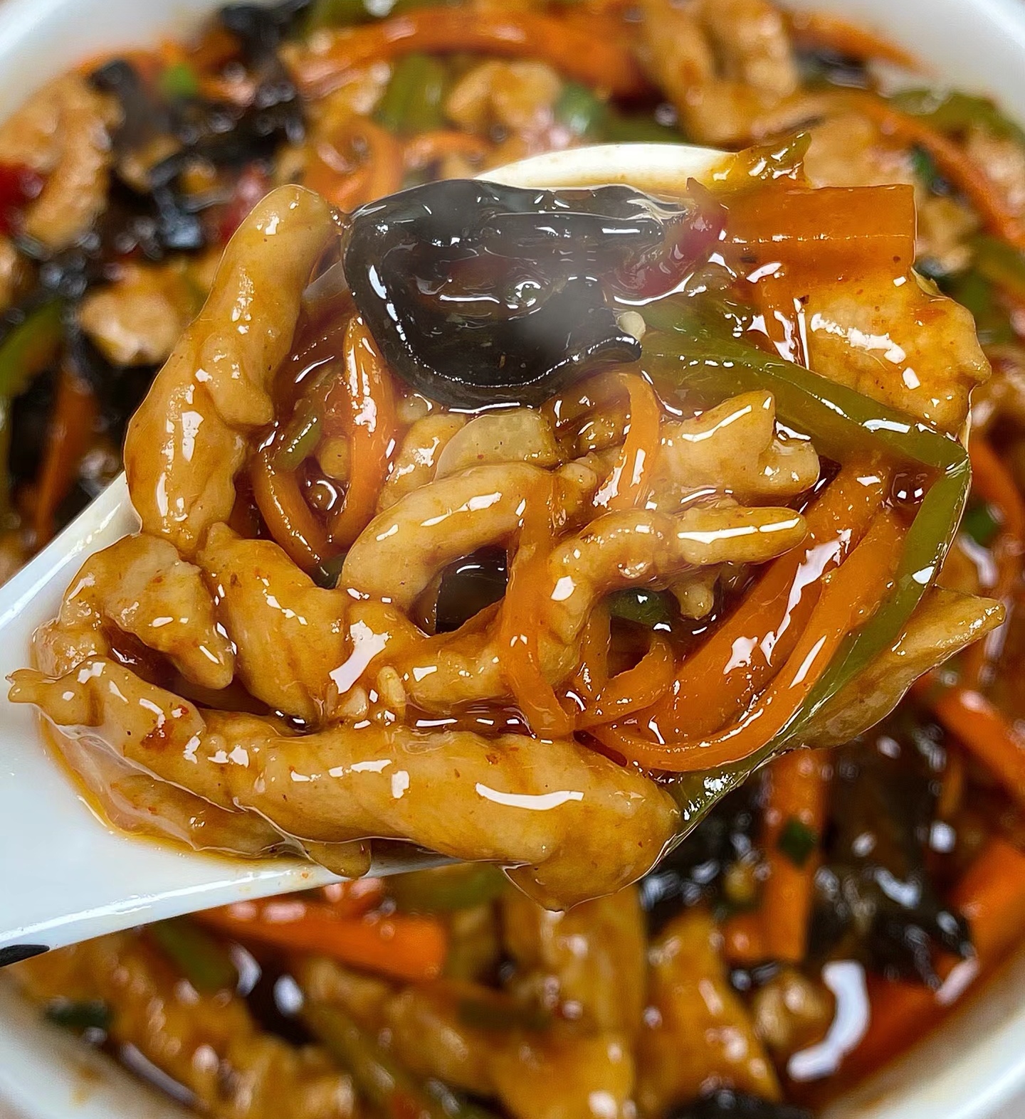 猪里脊肉、黑木耳、胡萝卜、青椒、小葱、蒜瓣、生抽、老抽、蚝油、料酒、淀粉、盐、白糖、醋、豆瓣酱、食用油